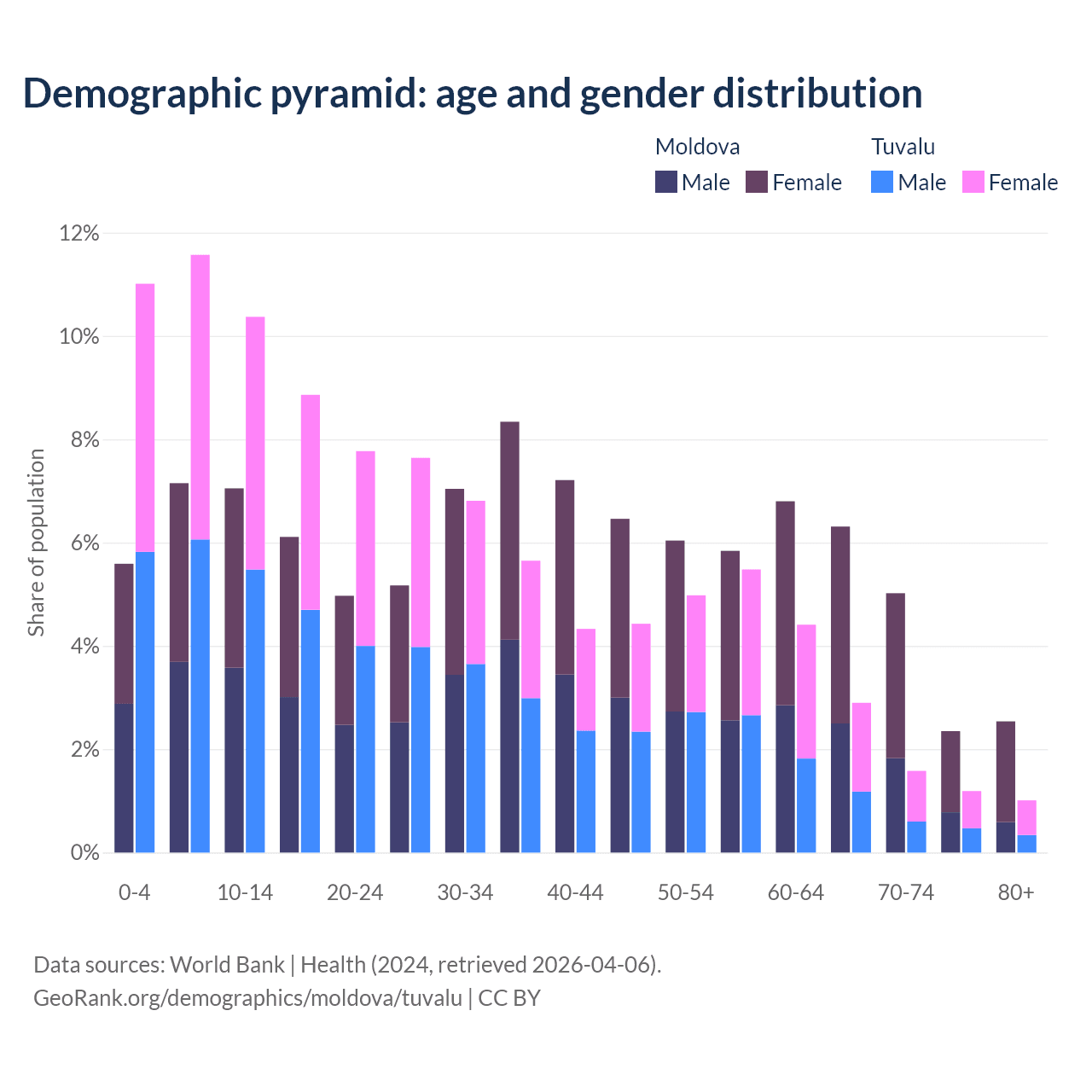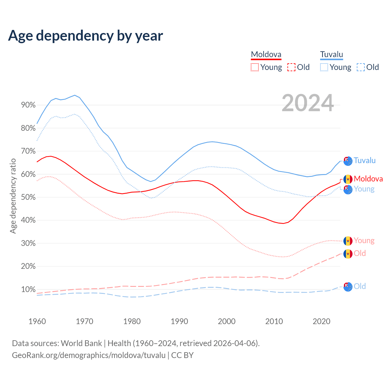 - The share of old-age demographic (65+) in Moldova is 16.2% vs 6.67% in Tuvalu.