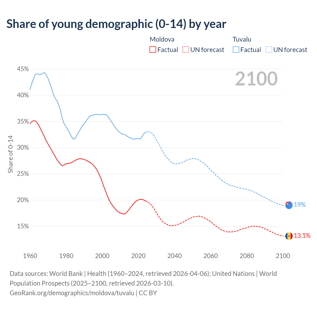 - The share of young demographic (0-15 years old) in Moldova is 19.8% vs 32.9% in Tuvalu.