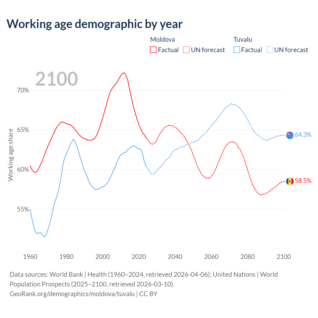 Median age Moldova vs Tuvalu, 1960-2100