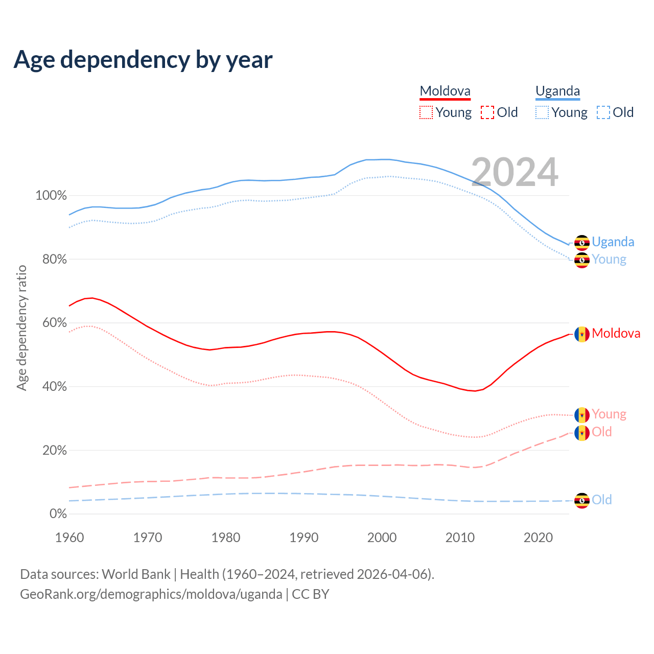 - Moldova is ranked 54/196 by median age (oldest to youngest) vs 187/196 for Uganda.