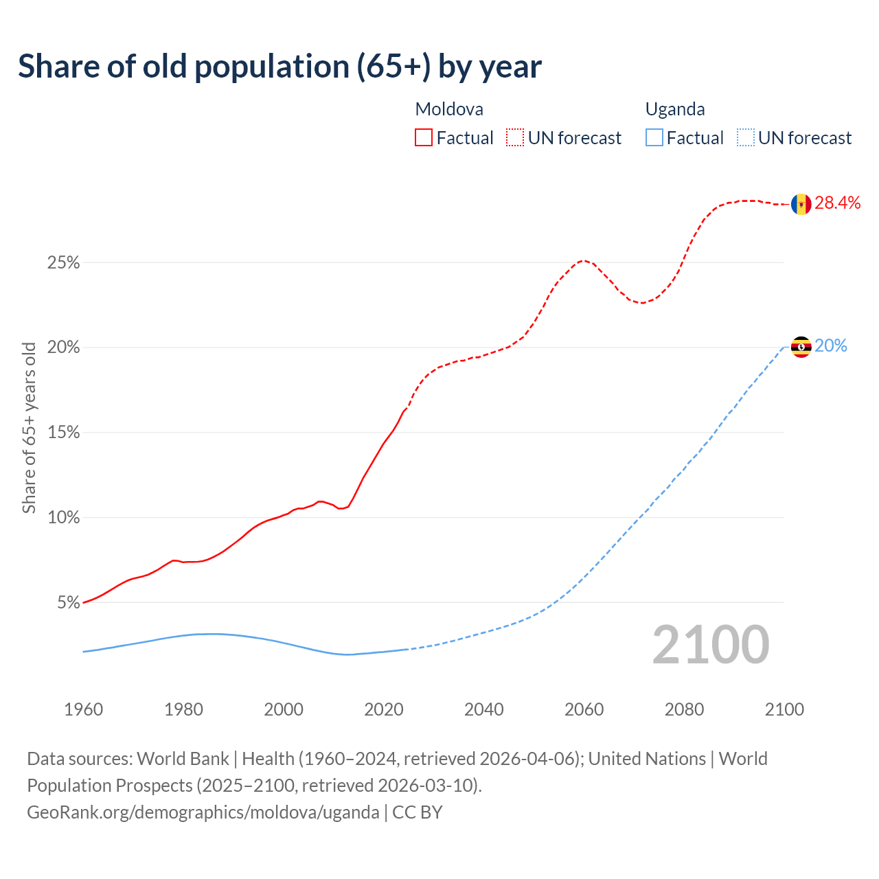 The share of older people aged 65 and over is 16.2% in Moldova and 2.19% in Uganda. Life expectancy in Moldova compared to Uganda .