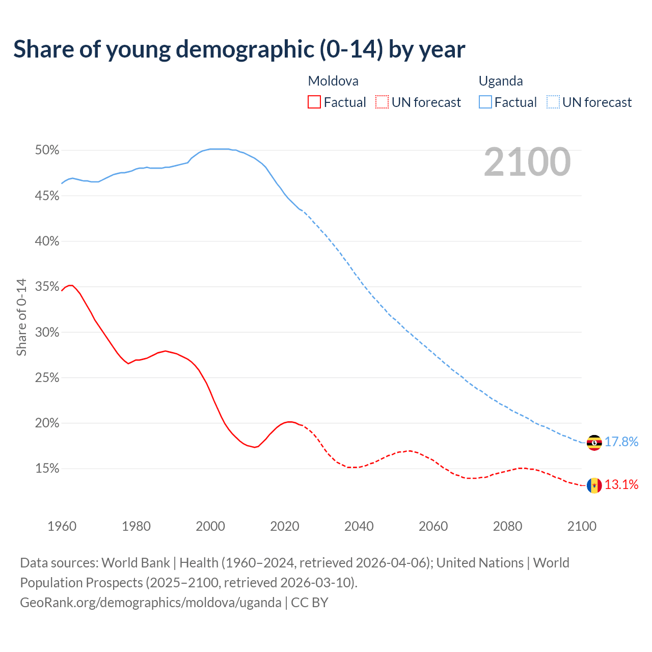 - The share of young demographic (0-15 years old) in Moldova is 19.8% vs 43.5% in Uganda.
