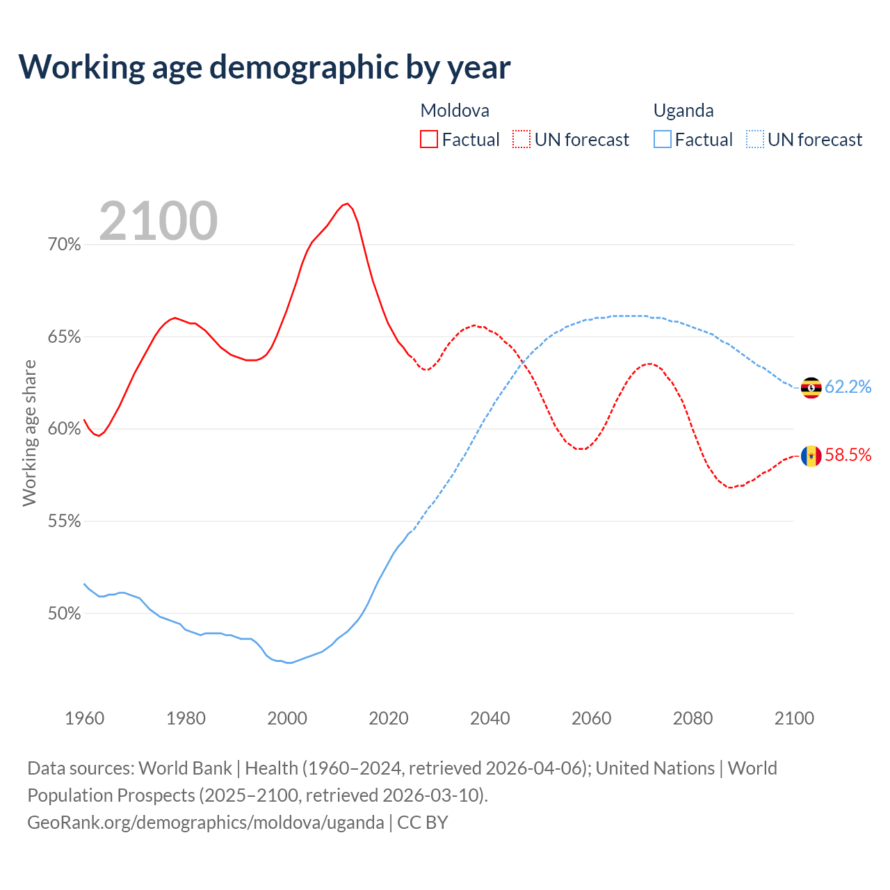 Median age Moldova vs Uganda, 1960-2100