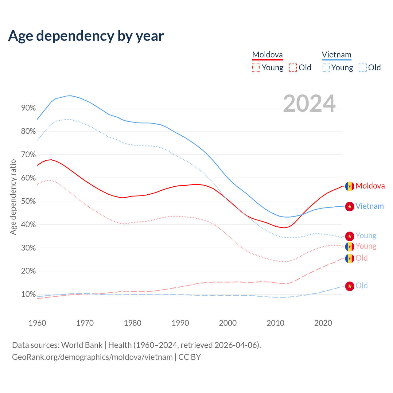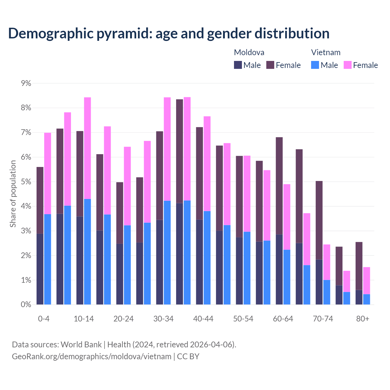 - Moldova is ranked 54/196 by median age (oldest to youngest) vs 84/196 for Vietnam.