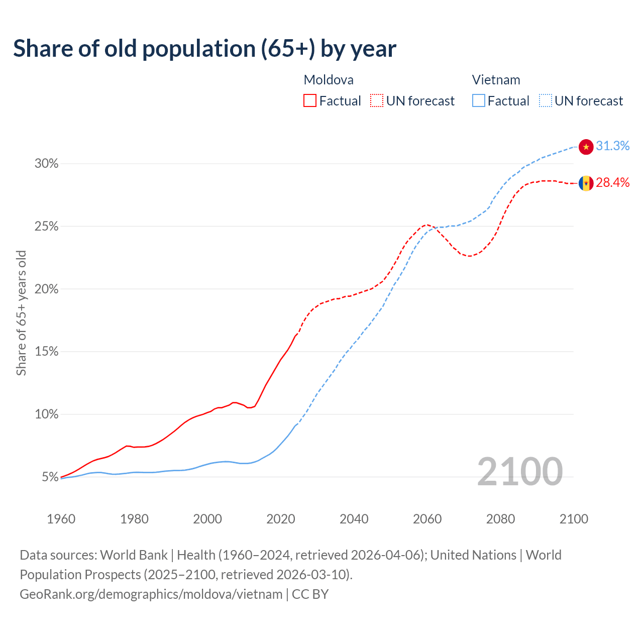 The share of older people aged 65 and over is 16.2% in Moldova and 9.05% in Vietnam. Life expectancy in Moldova compared to Vietnam .