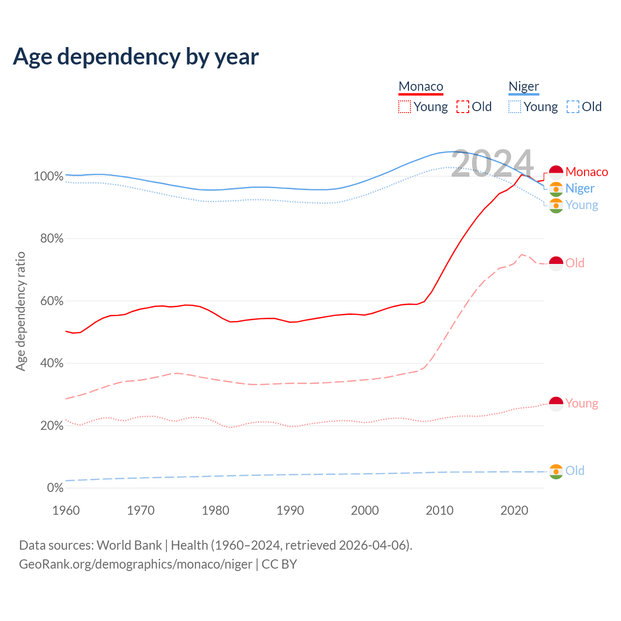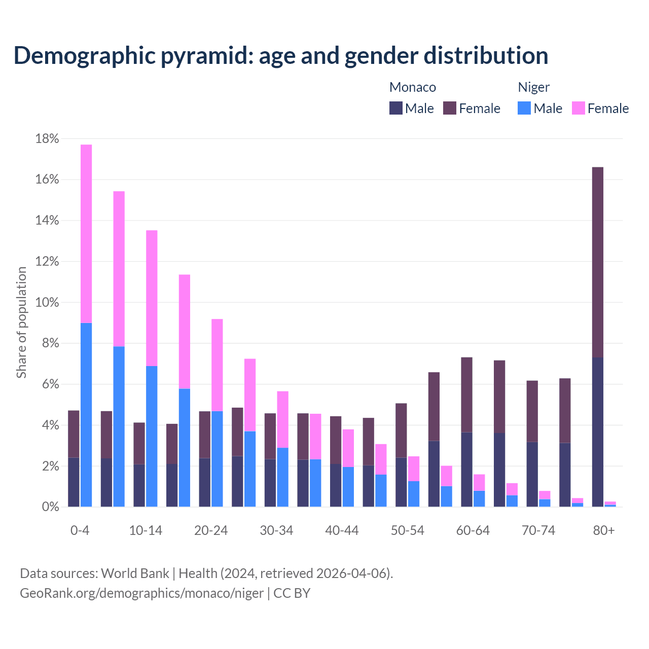 - Monaco is ranked 1/196 by median age (oldest to youngest) vs 195/196 for Niger.