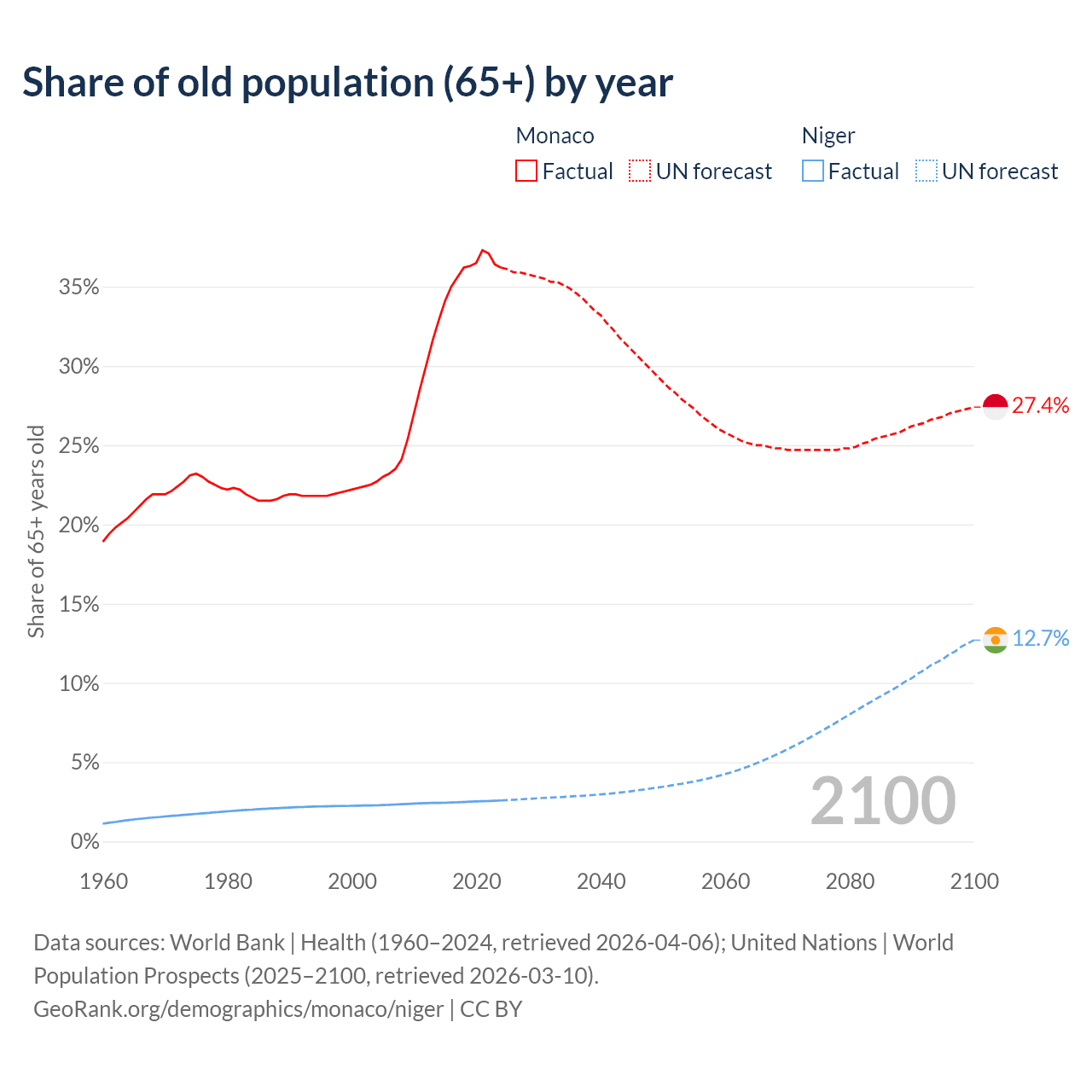 The share of older people aged 65 and over is 36.2% in Monaco and 2.59% in Niger. Life expectancy in Monaco compared to Niger .