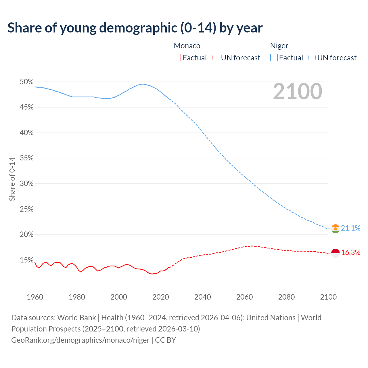 - The share of young demographic (0-15 years old) in Monaco is 13.5% vs 46.6% in Niger.