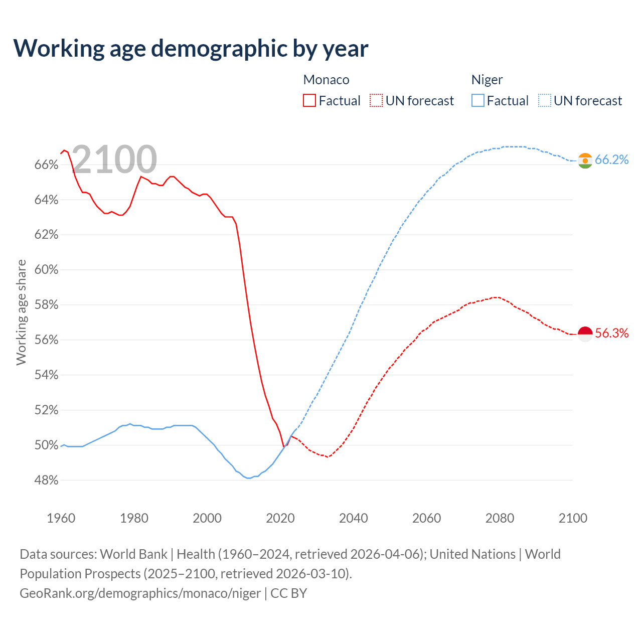 - Monaco has 19.2K working age adults (aged 15-64) vs 14.8M in Niger.