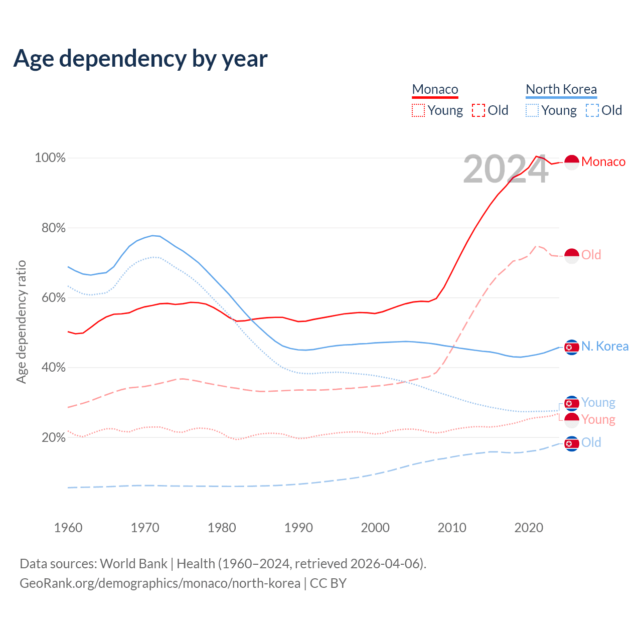 - The share of old-age demographic (65+) in Monaco is 36.2% vs 12.4% in North Korea.