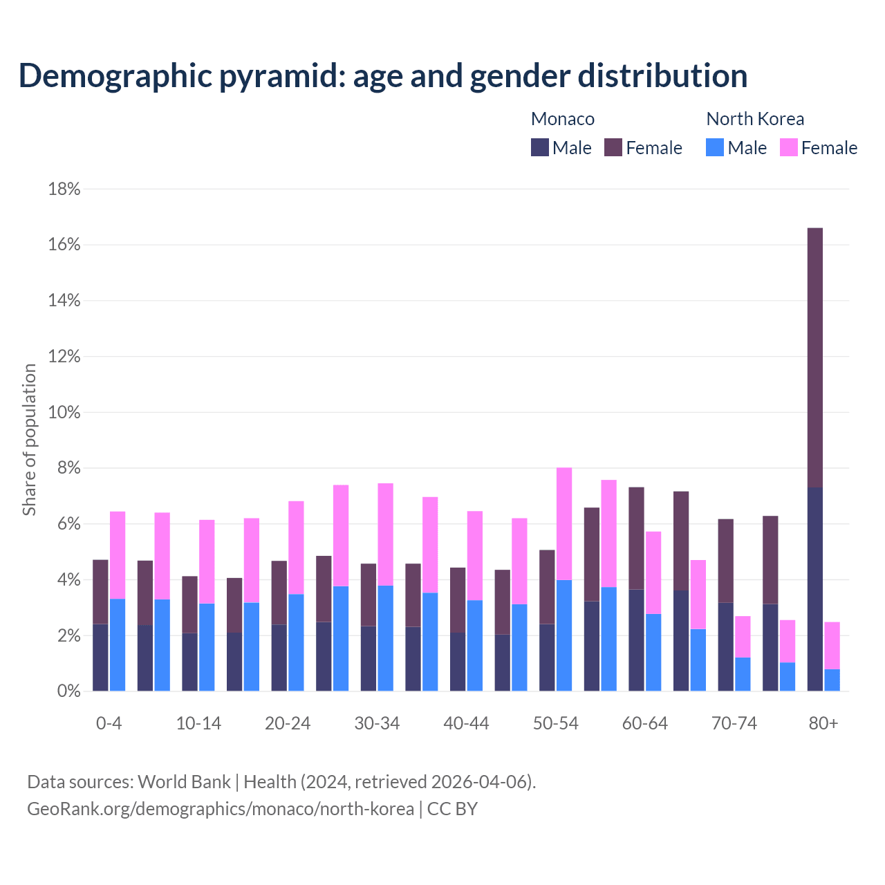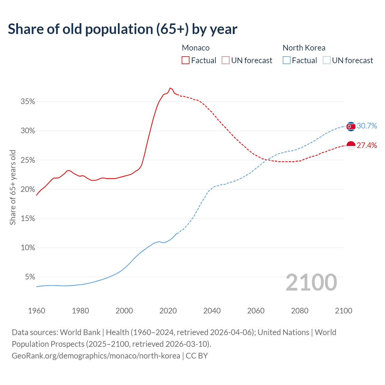 The share of older people aged 65 and over is 36.2% in Monaco and 12.4% in North Korea. Life expectancy in Monaco compared to North Korea .