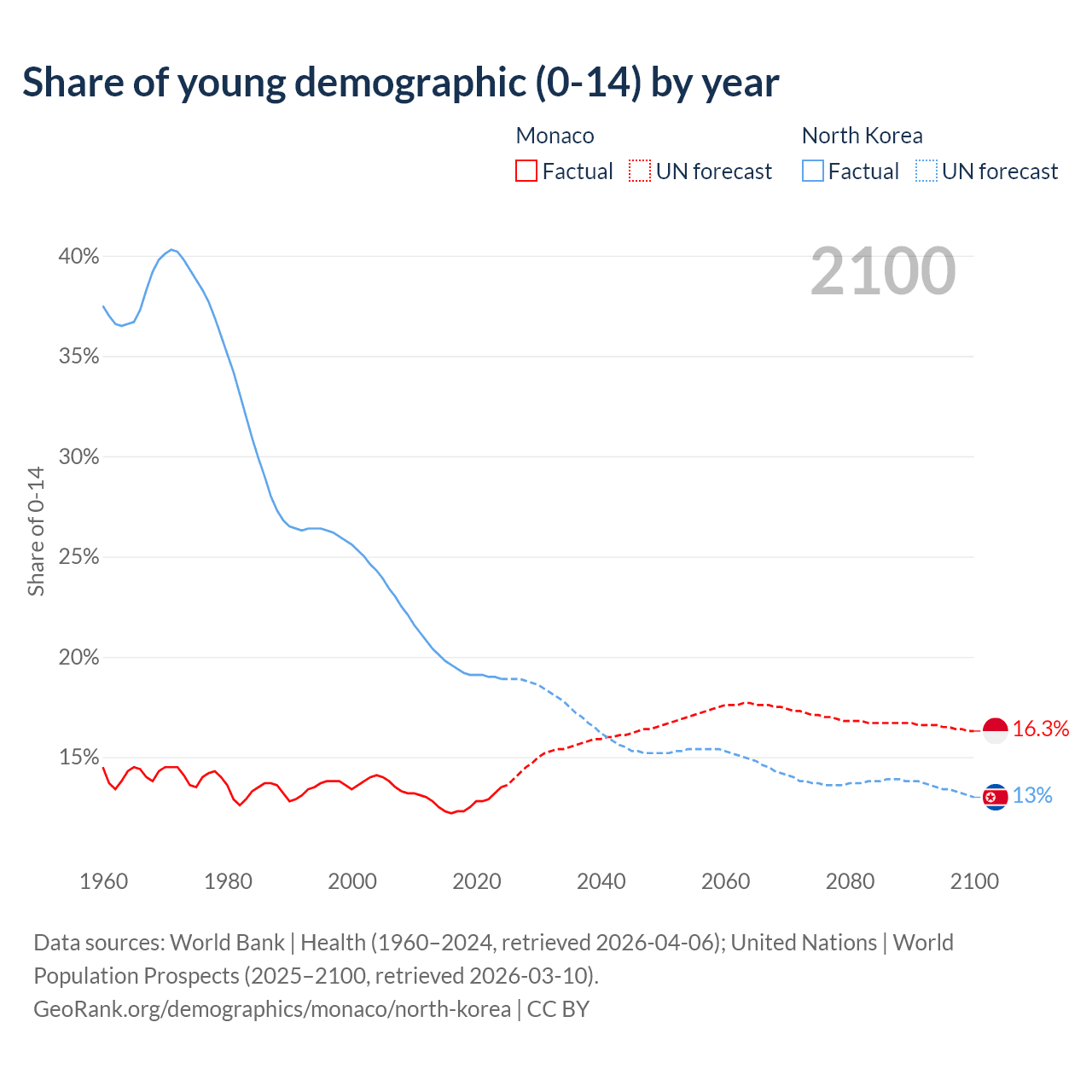 - The share of young demographic (0-15 years old) in Monaco is 13.5% vs 18.9% in North Korea.