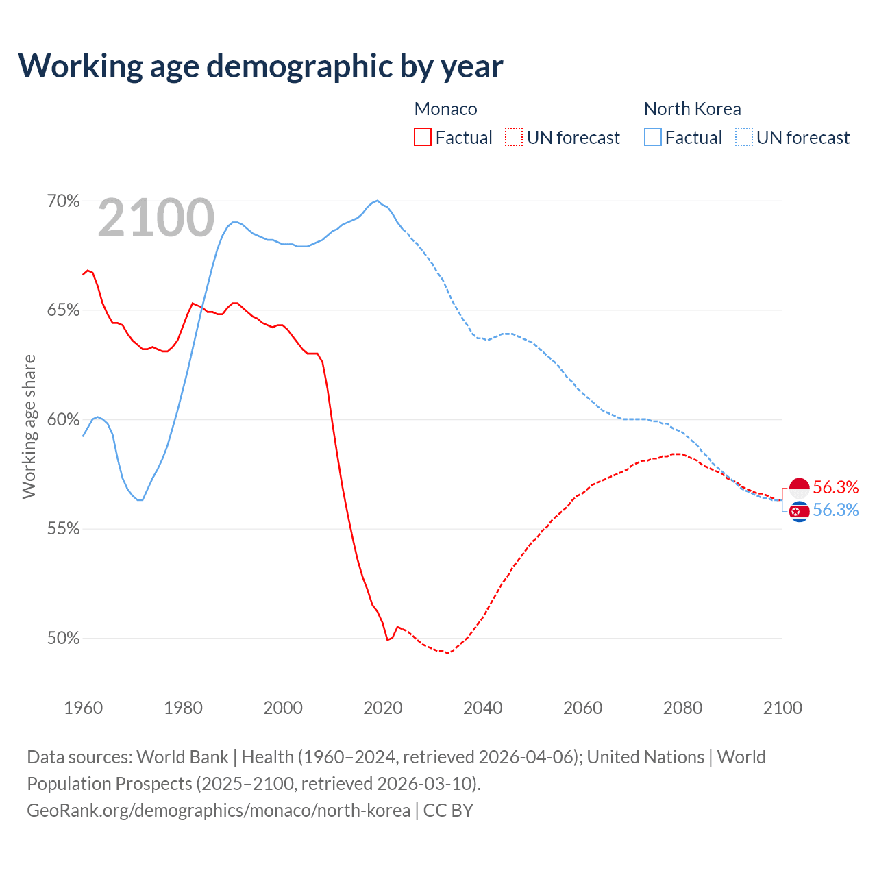 - Monaco has 19.2K working age adults (aged 15-64) vs 18.3M in North Korea.