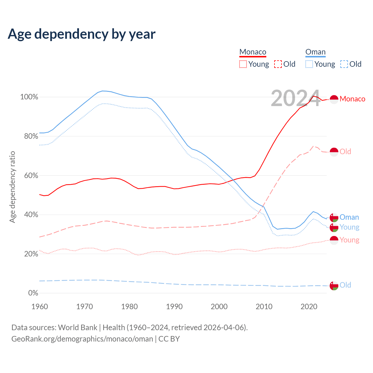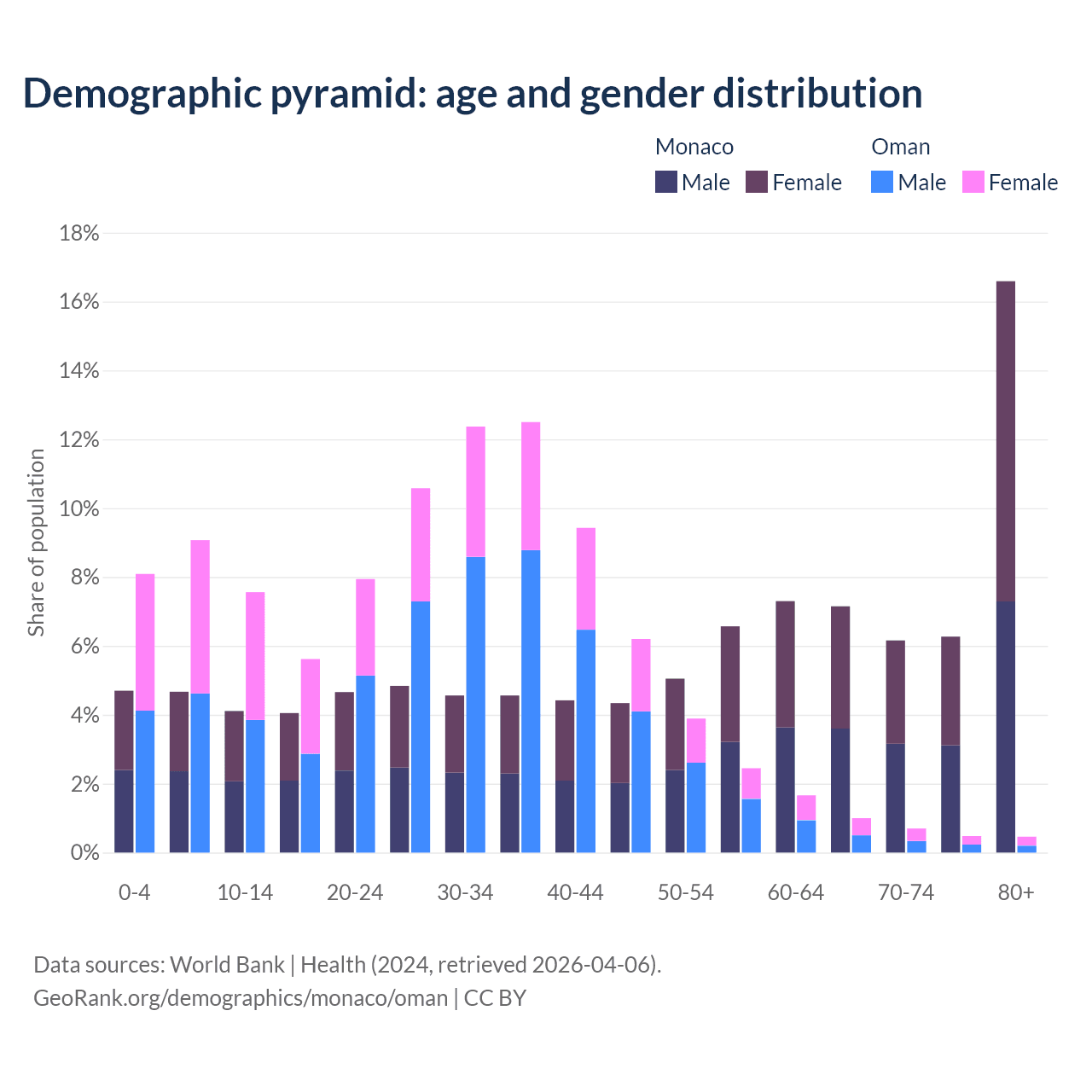 - Monaco is ranked 1/196 by median age (oldest to youngest) vs 101/196 for Oman.