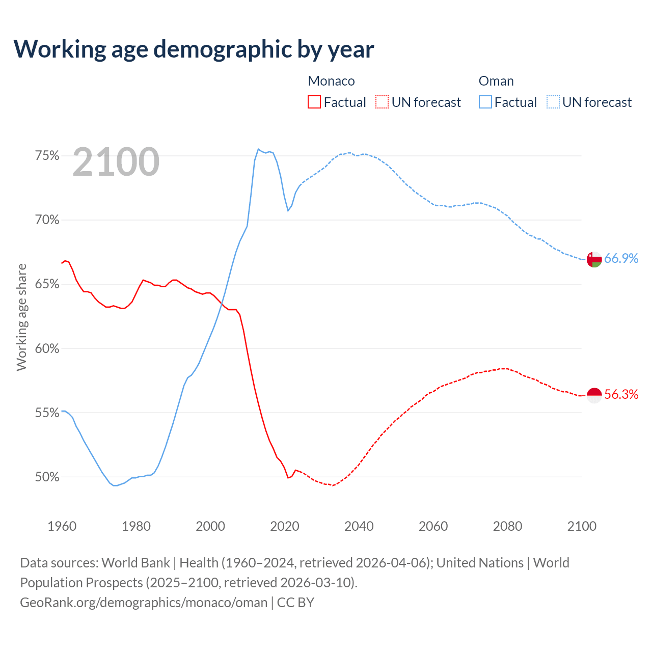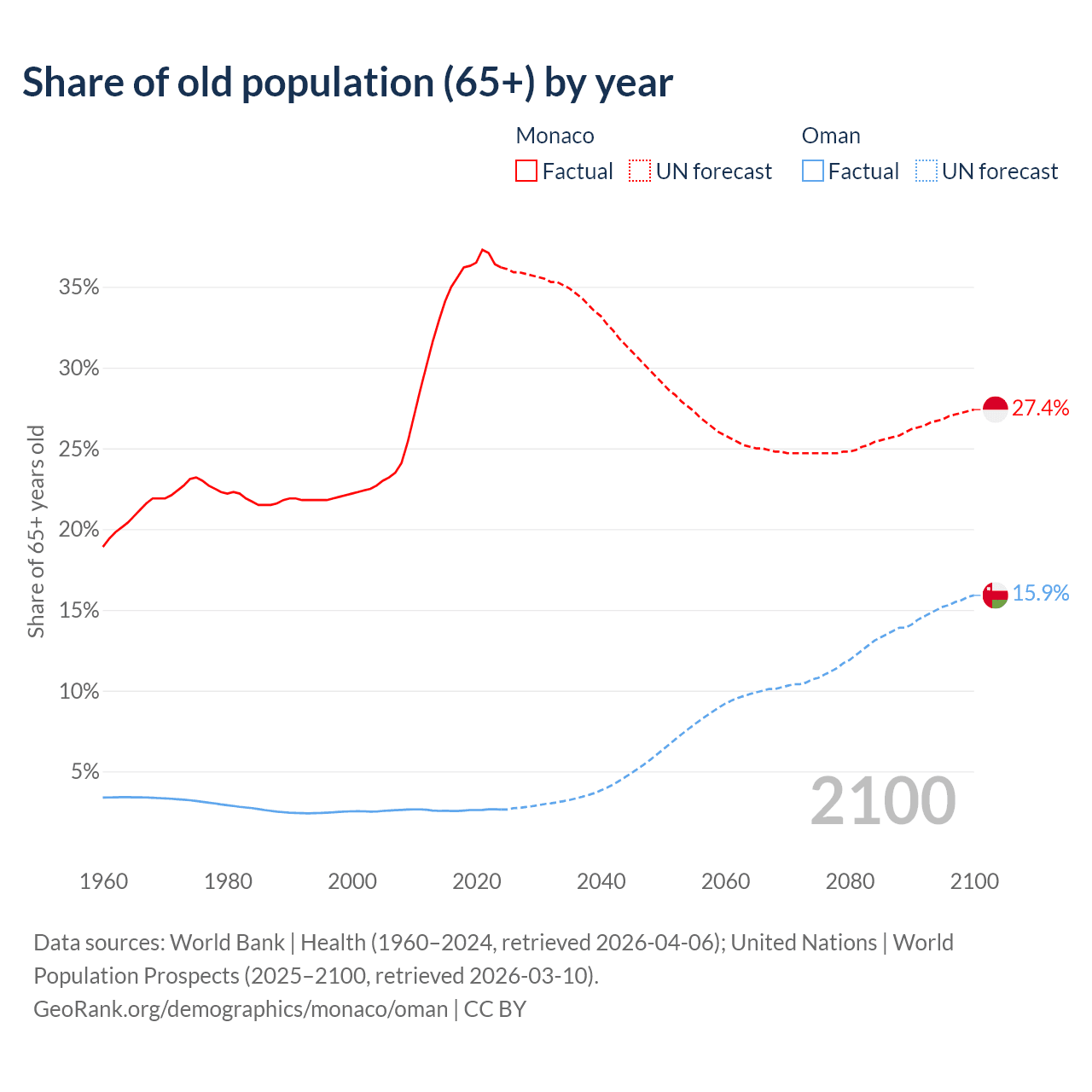 The share of older people aged 65 and over is 36.2% in Monaco and 2.64% in Oman. Life expectancy in Monaco compared to Oman .