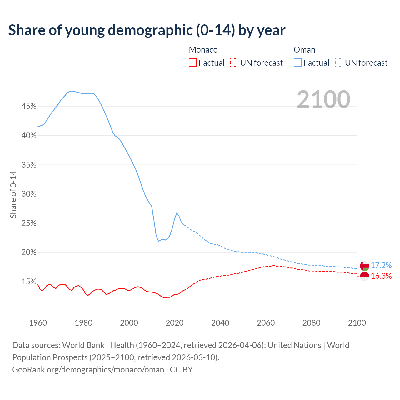 - The share of young demographic (0-15 years old) in Monaco is 13.5% vs 24.7% in Oman.