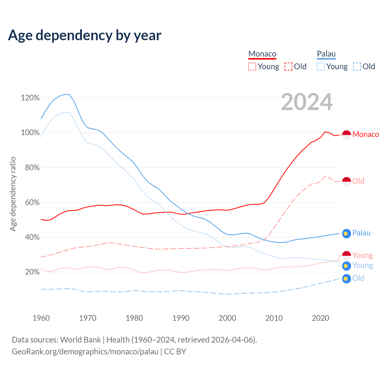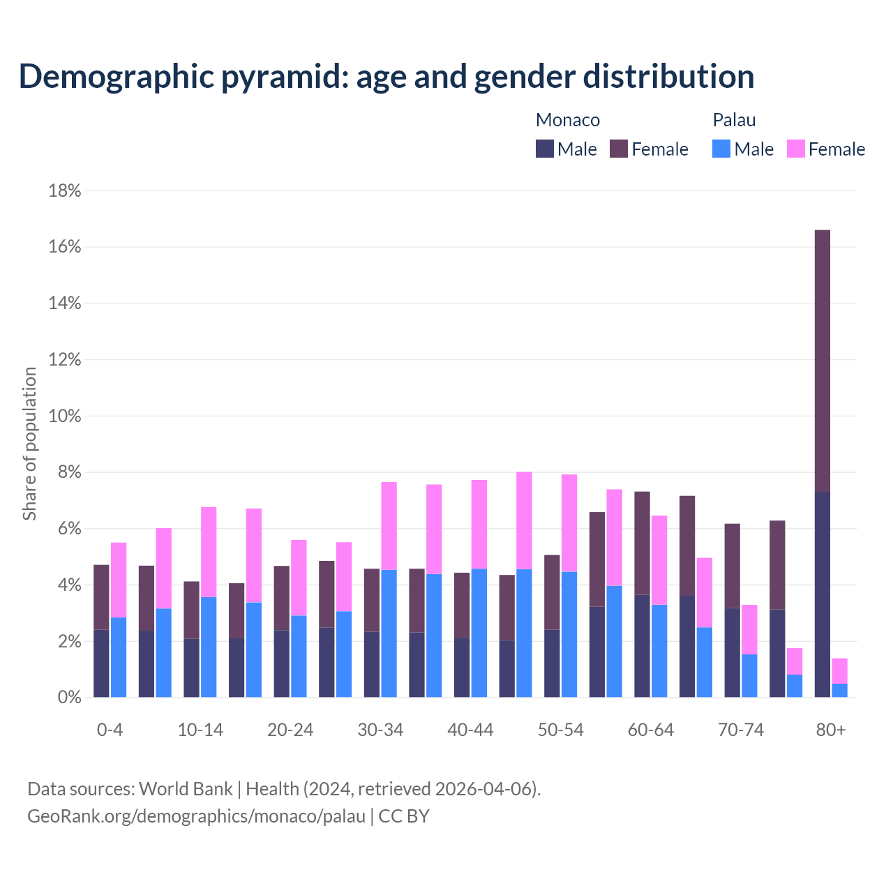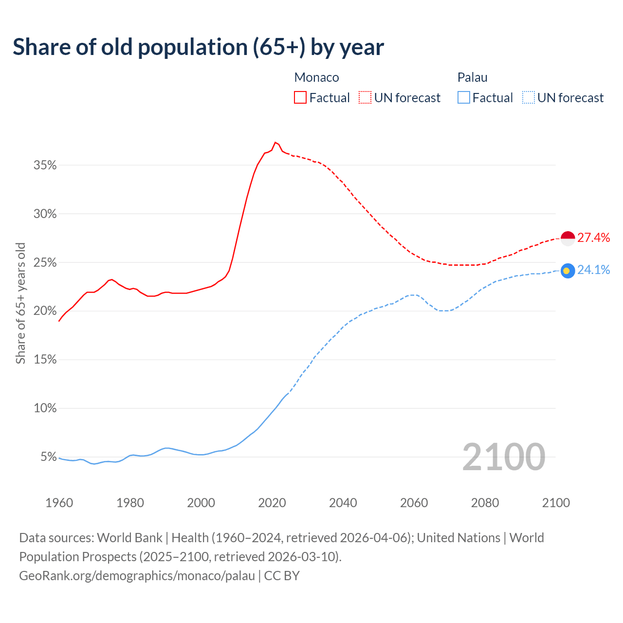 - The share of old-age demographic (65+) in Monaco is 36.2% vs 11.3% in Palau.