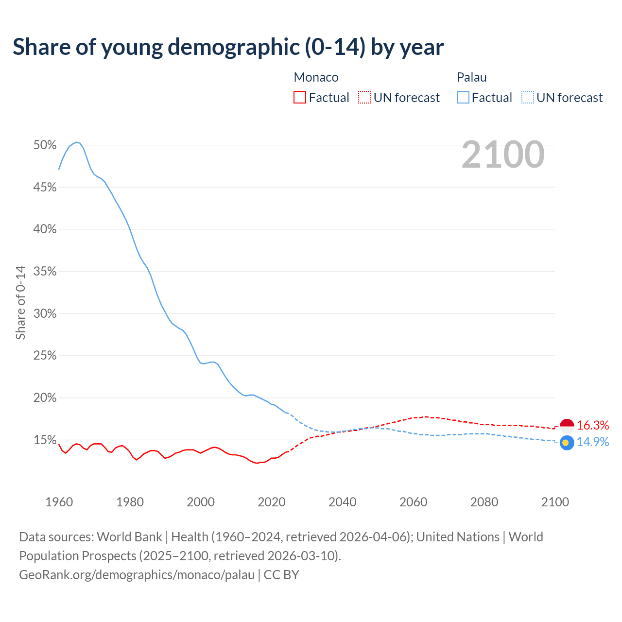 - The share of young demographic (0-15 years old) in Monaco is 13.5% vs 18.2% in Palau.