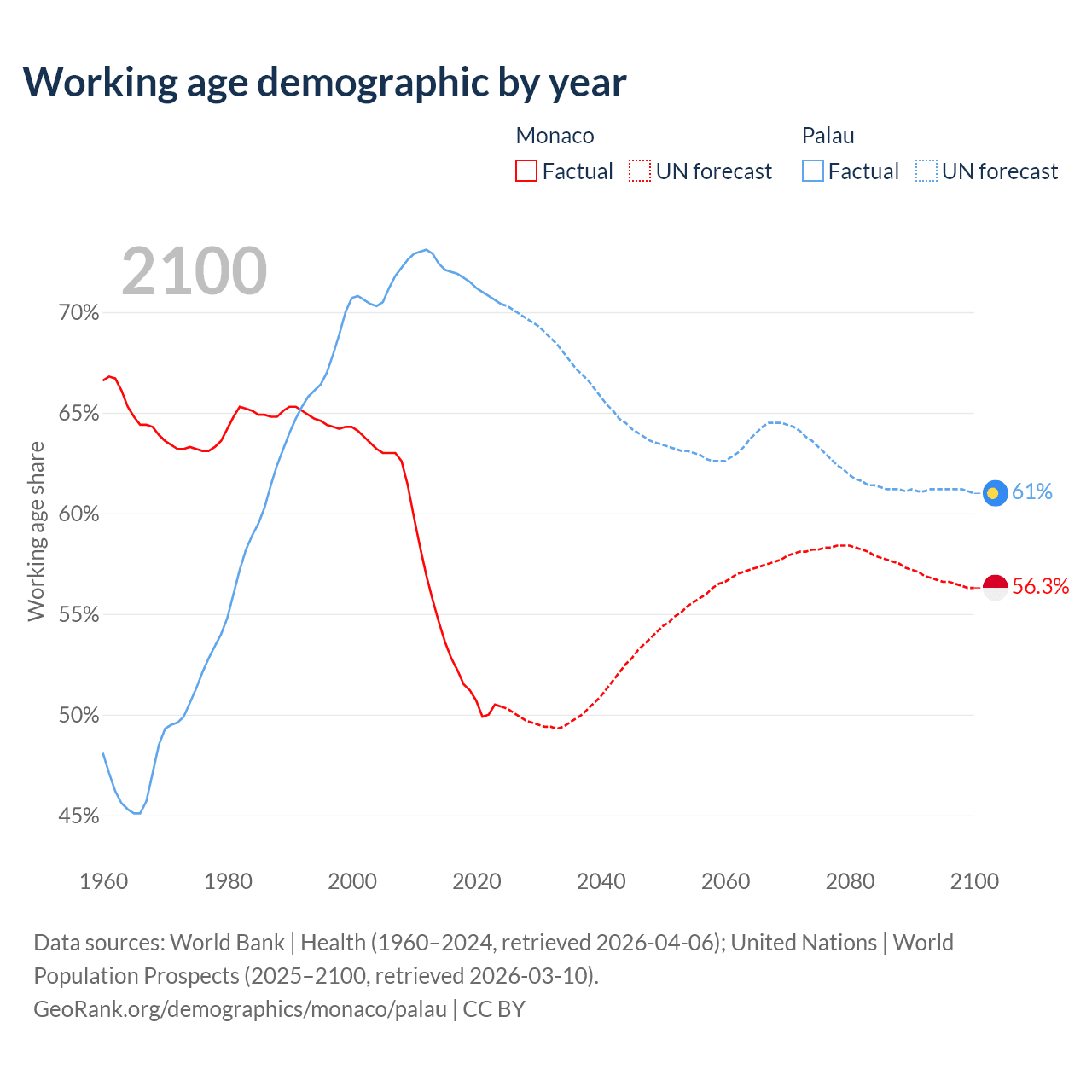 - Monaco has 19.2K working age adults (aged 15-64) vs 12.4K in Palau.