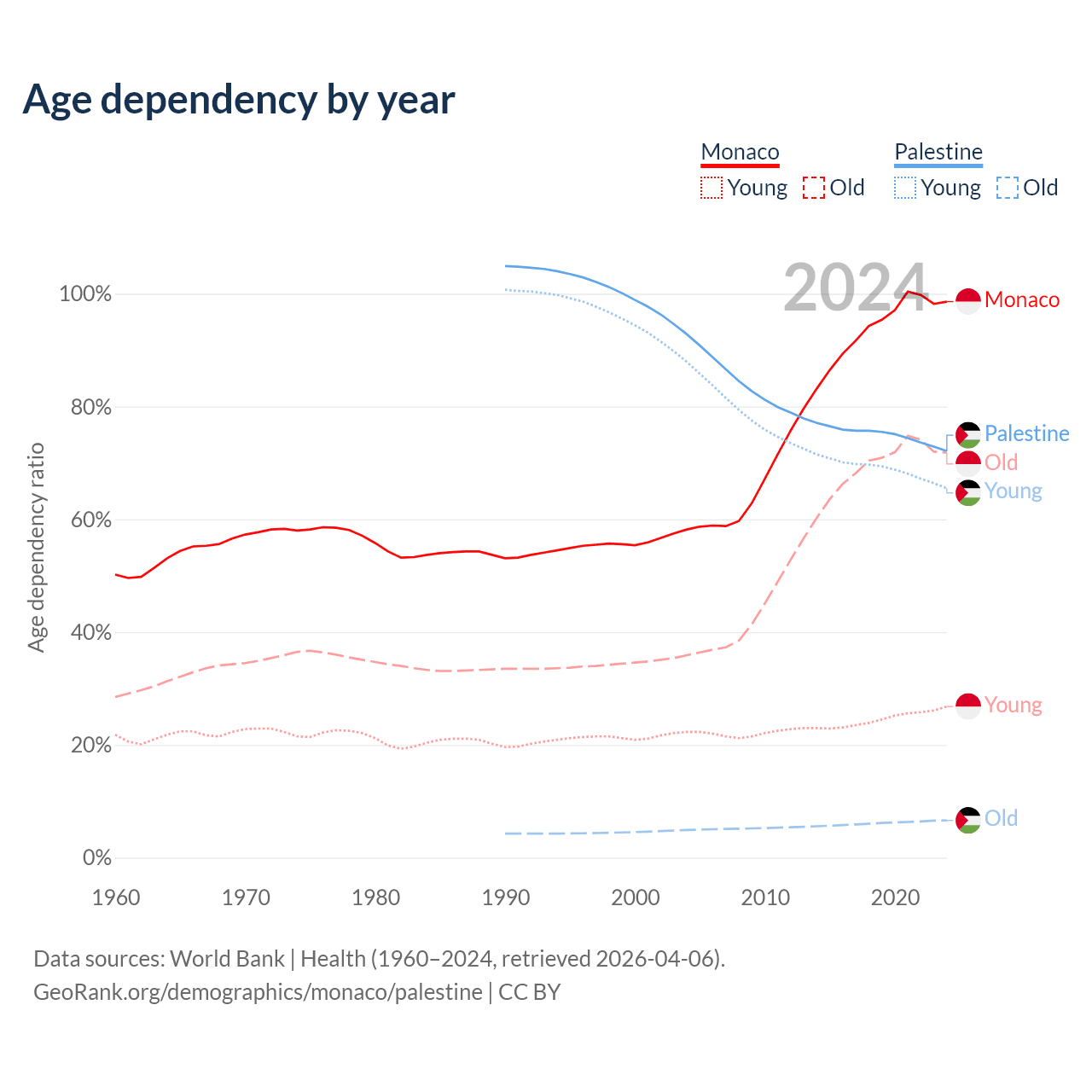 - The share of old-age demographic (65+) in Monaco is 36.2% vs 3.84% in Palestine.