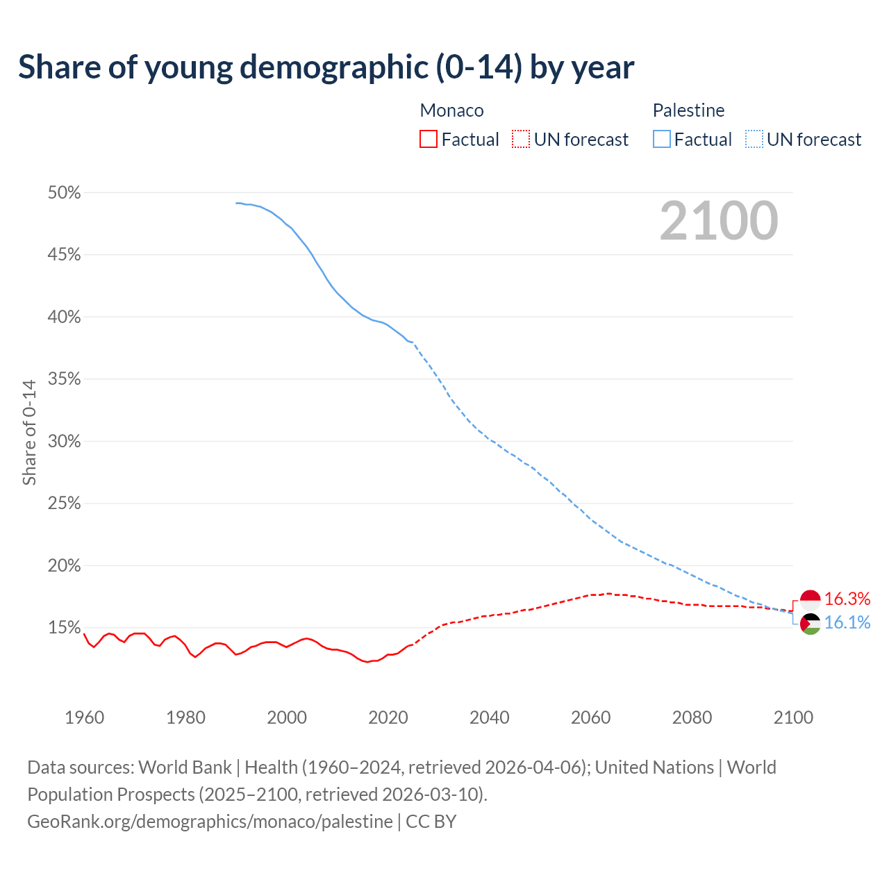- The share of young demographic (0-15 years old) in Monaco is 13.5% vs 38% in Palestine.