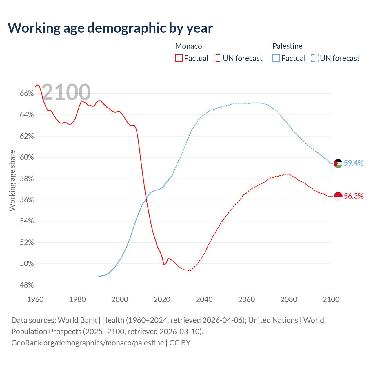 Median age Monaco vs Palestine, 1960-2100