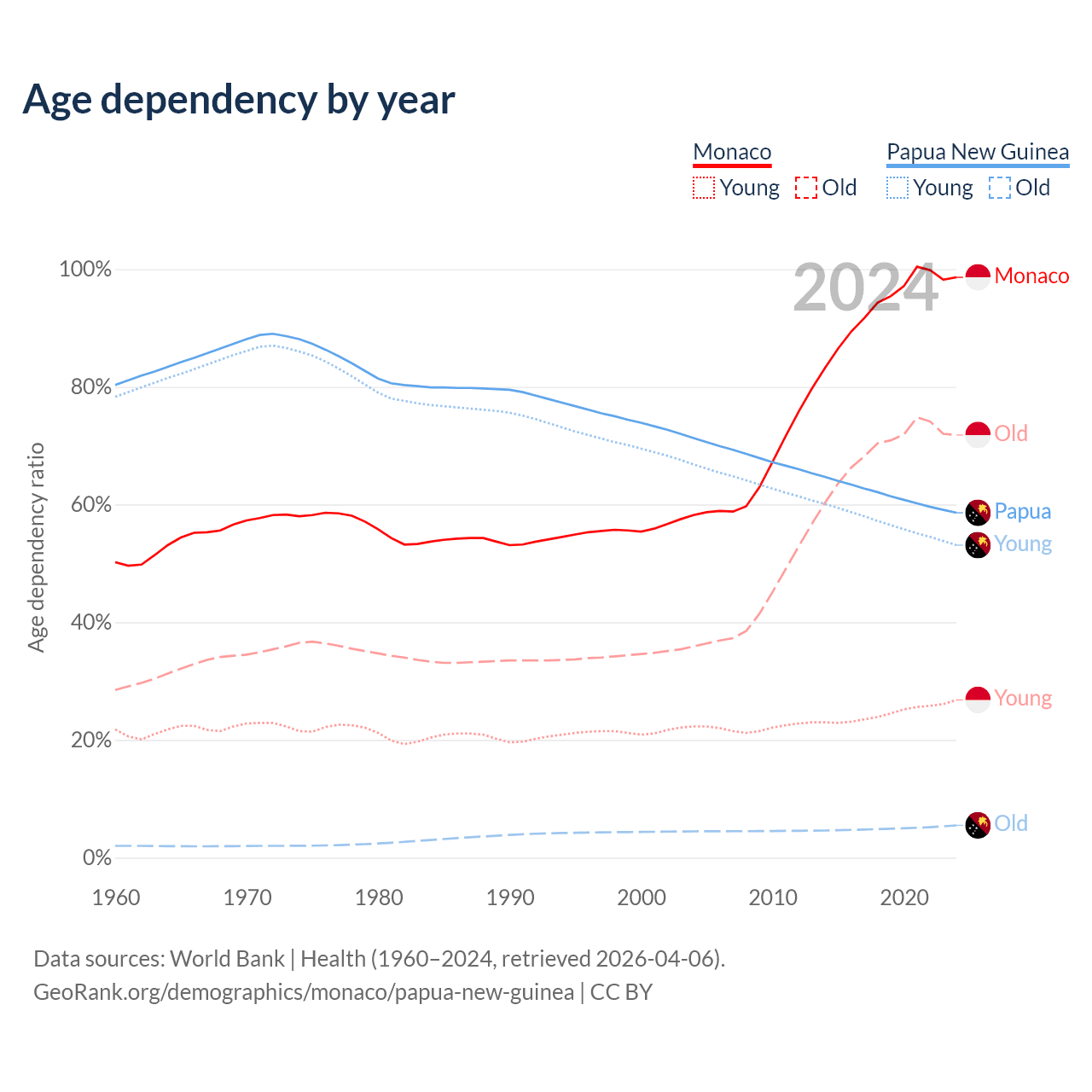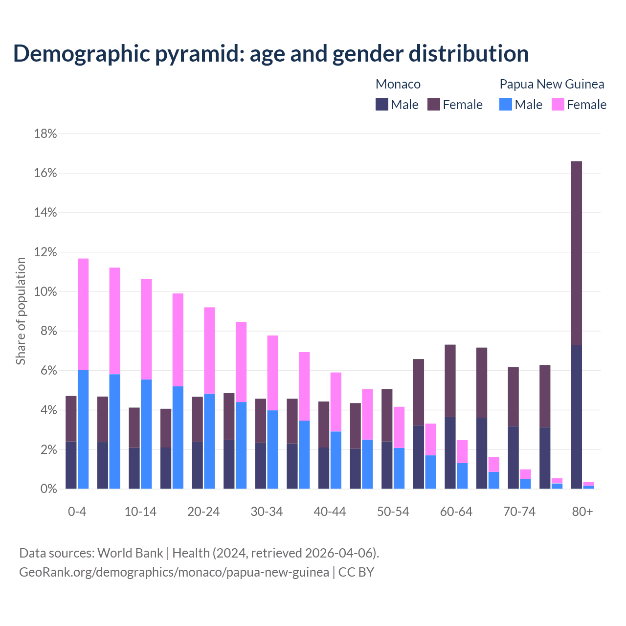 - Monaco is ranked 1/196 by median age (oldest to youngest) vs 140/196 for Papua New Guinea.