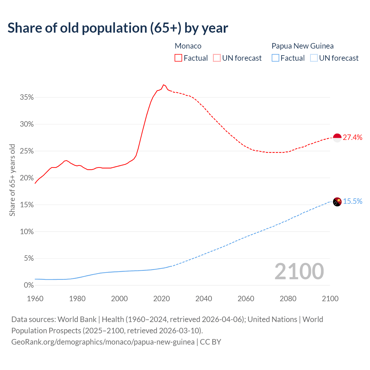 The share of older people aged 65 and over is 36.2% in Monaco and 3.46% in Papua New Guinea. Life expectancy in Monaco compared to Papua New Guinea .