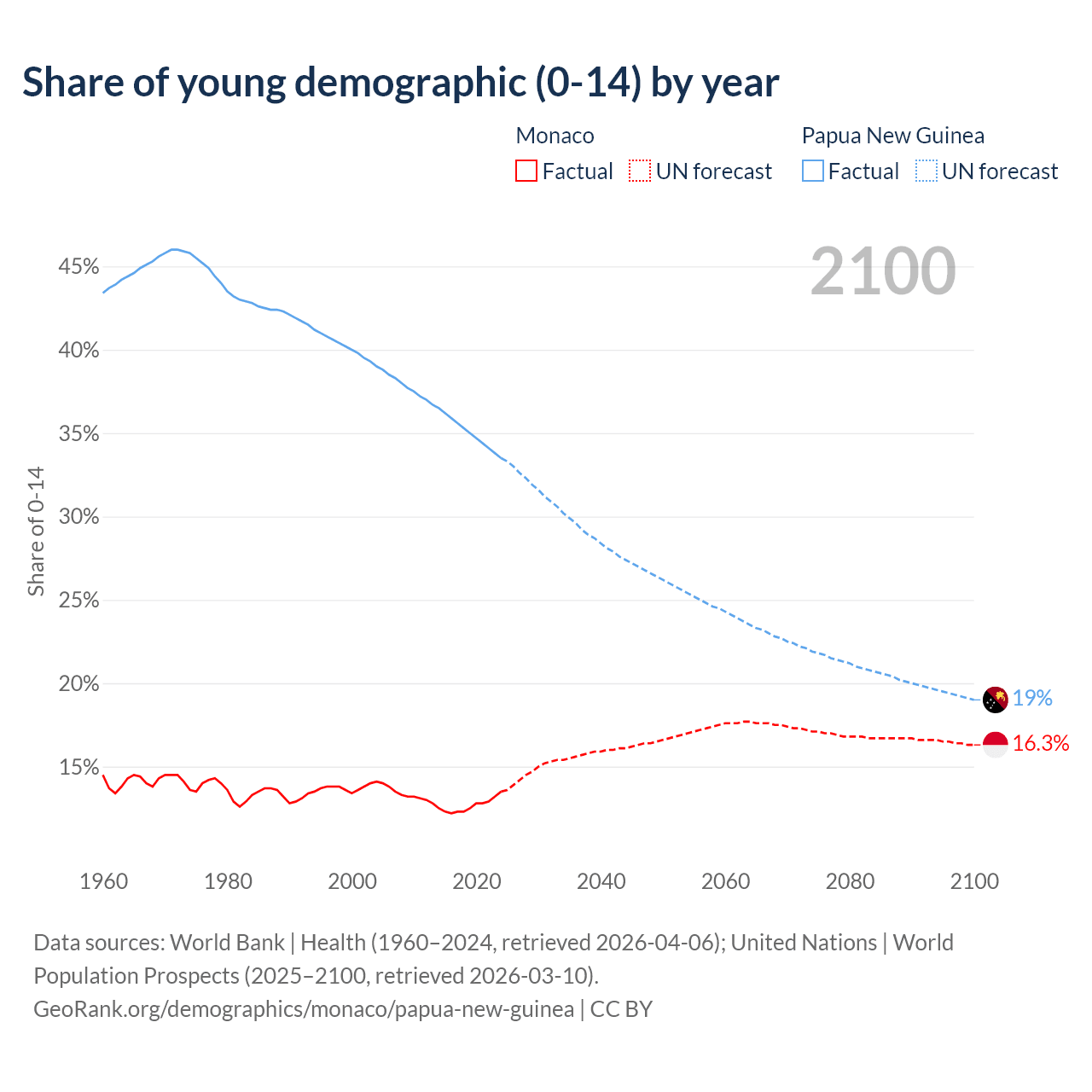 - The share of young demographic (0-15 years old) in Monaco is 13.5% vs 33.5% in Papua New Guinea.