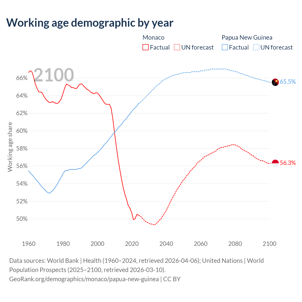 - Monaco has 19.2K working age adults (aged 15-64) vs 6.94M in Papua New Guinea.