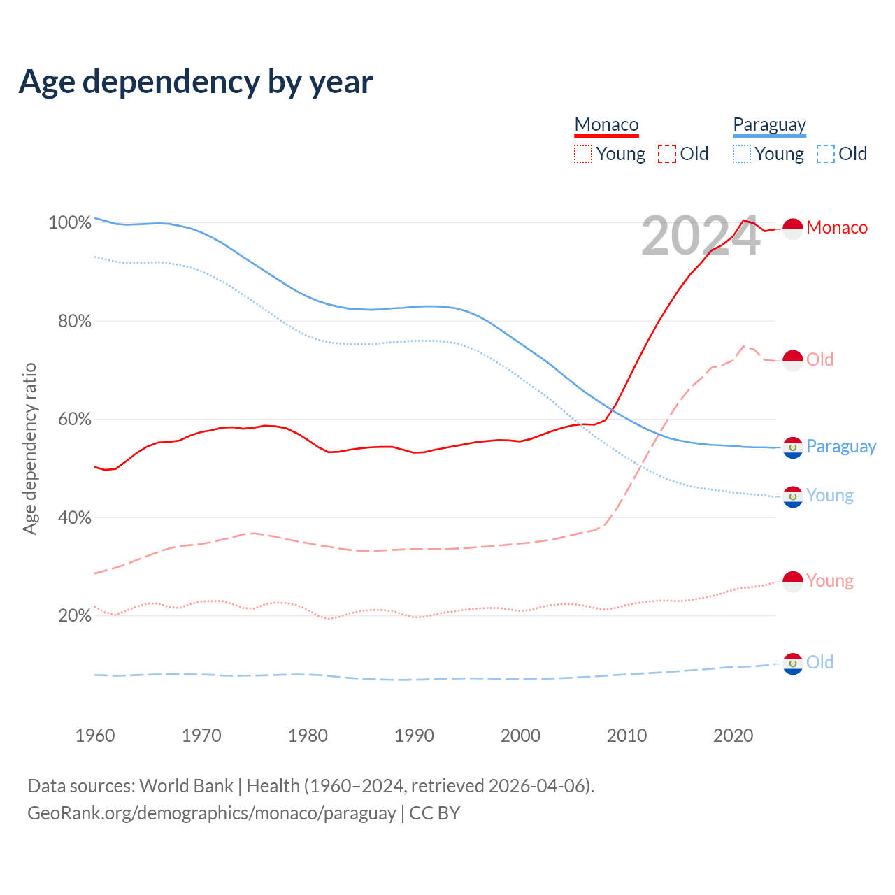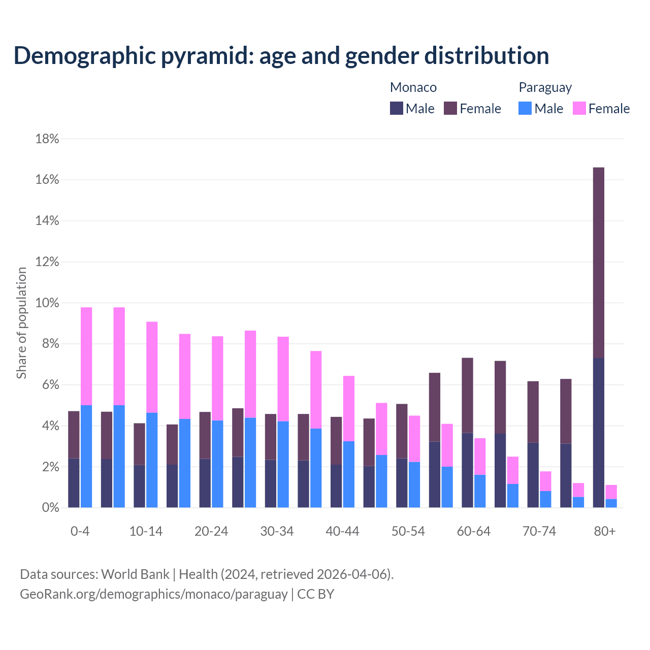 - The share of old-age demographic (65+) in Monaco is 36.2% vs 6.54% in Paraguay.