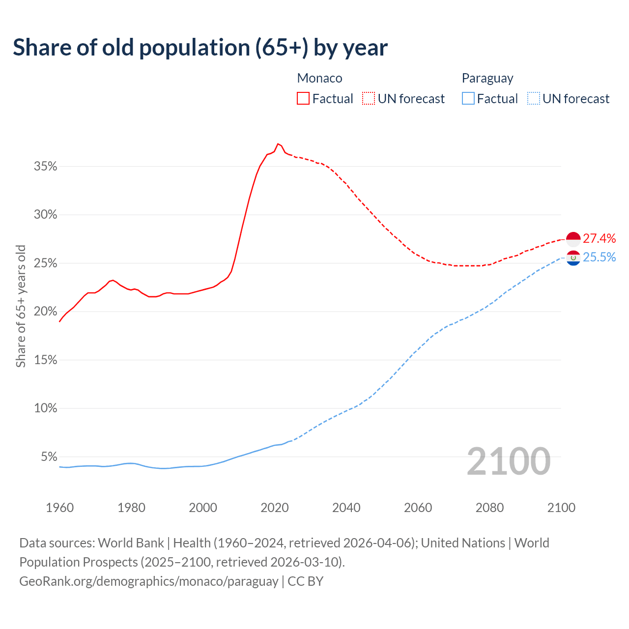 The share of older people aged 65 and over is 36.2% in Monaco and 6.54% in Paraguay. Life expectancy in Monaco compared to Paraguay .