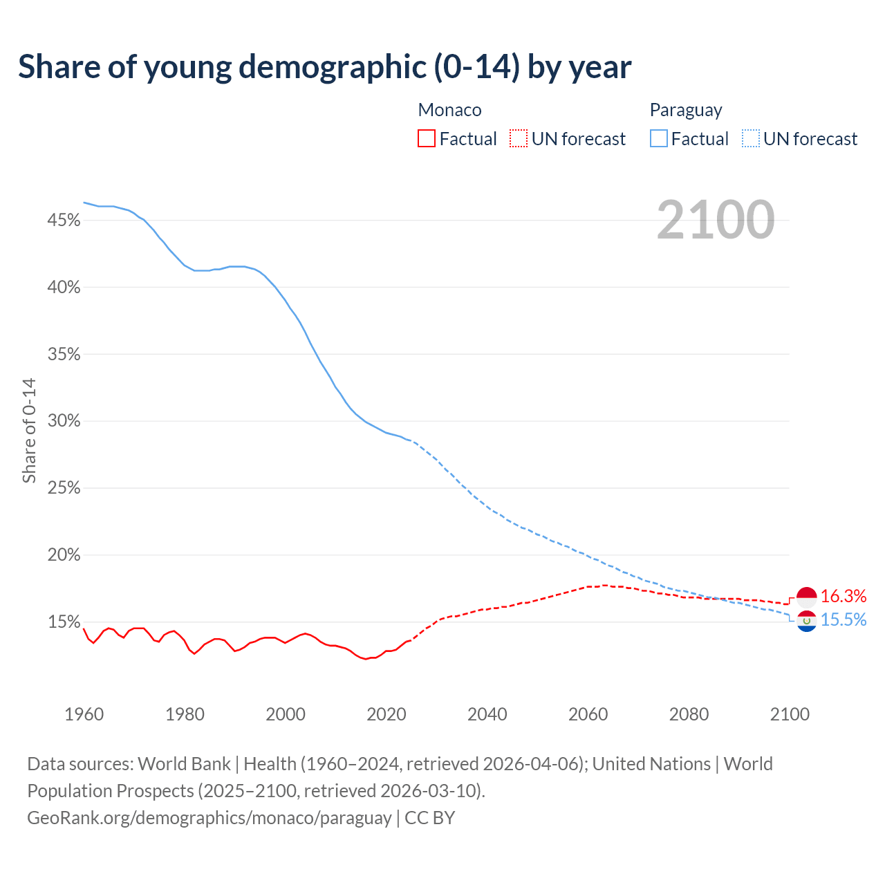 - The share of young demographic (0-15 years old) in Monaco is 13.5% vs 28.6% in Paraguay.