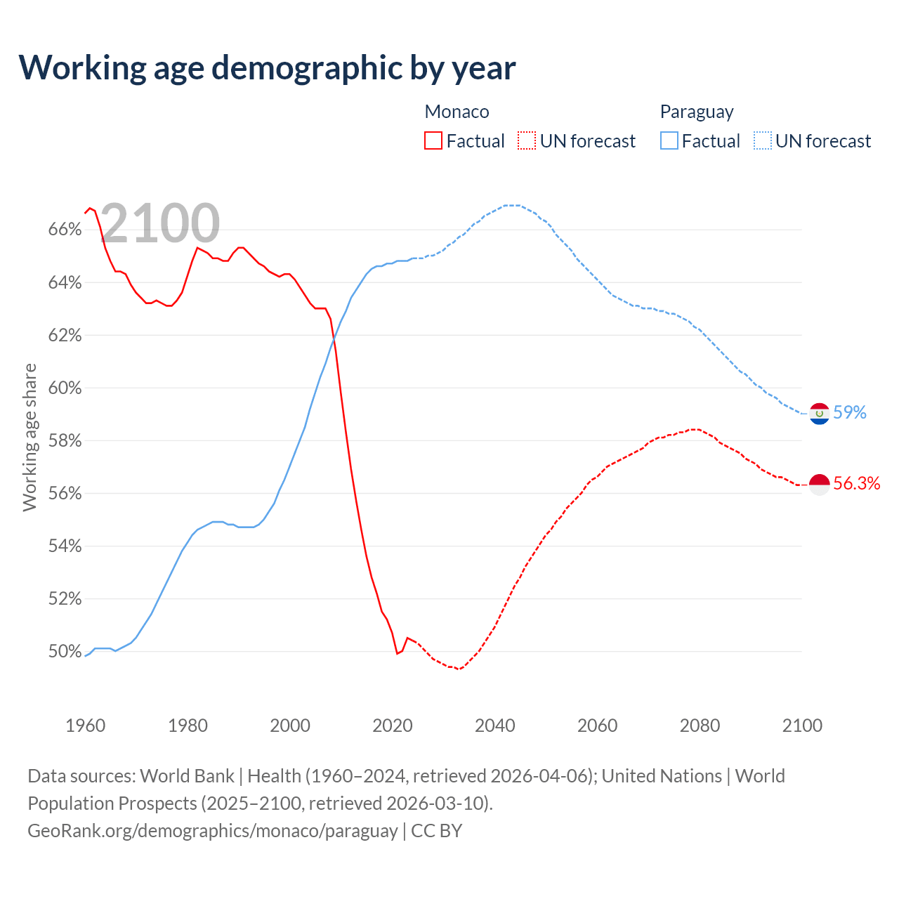 Median age Monaco vs Paraguay, 1960-2100