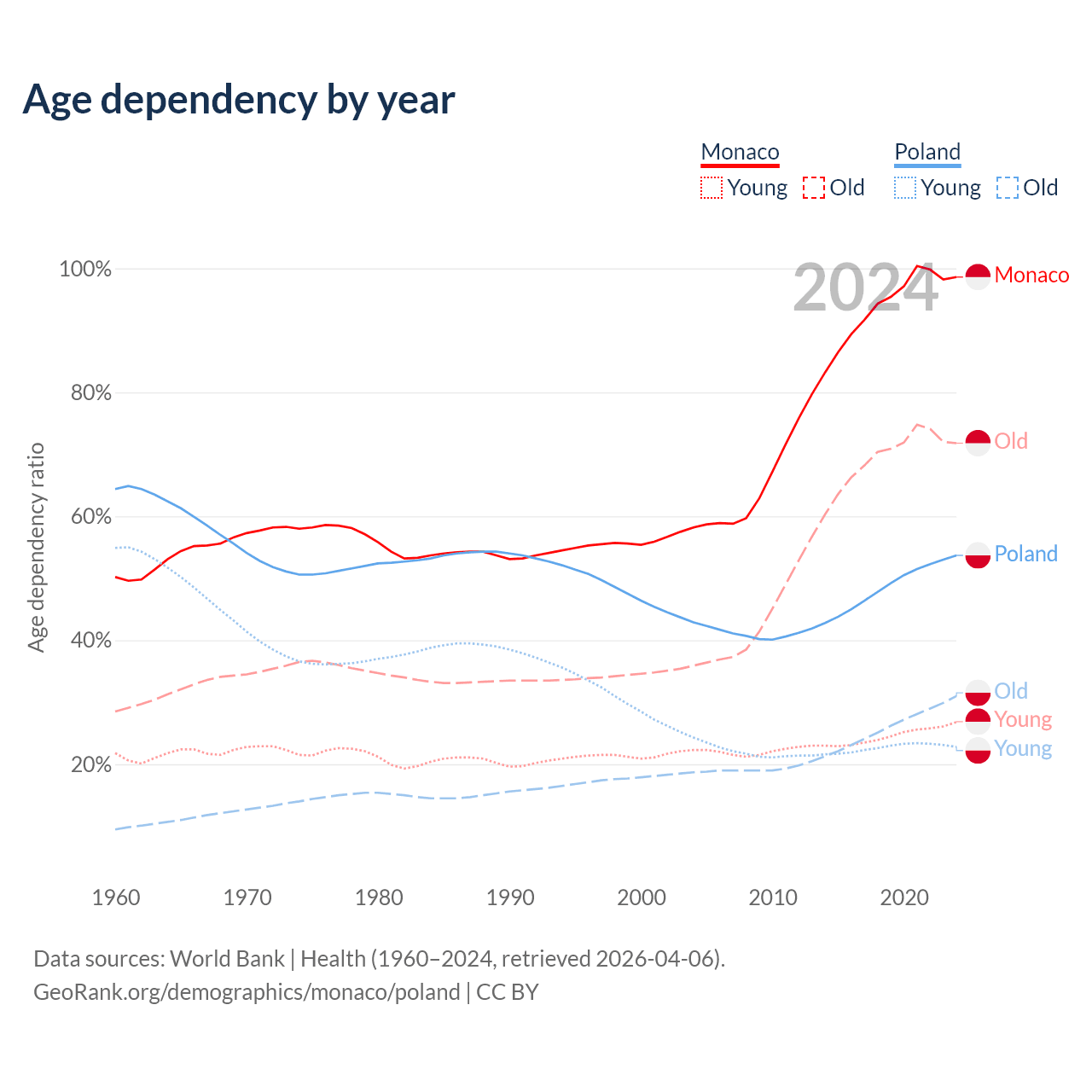 - The share of old-age demographic (65+) in Monaco is 36.2% vs 20.1% in Poland.