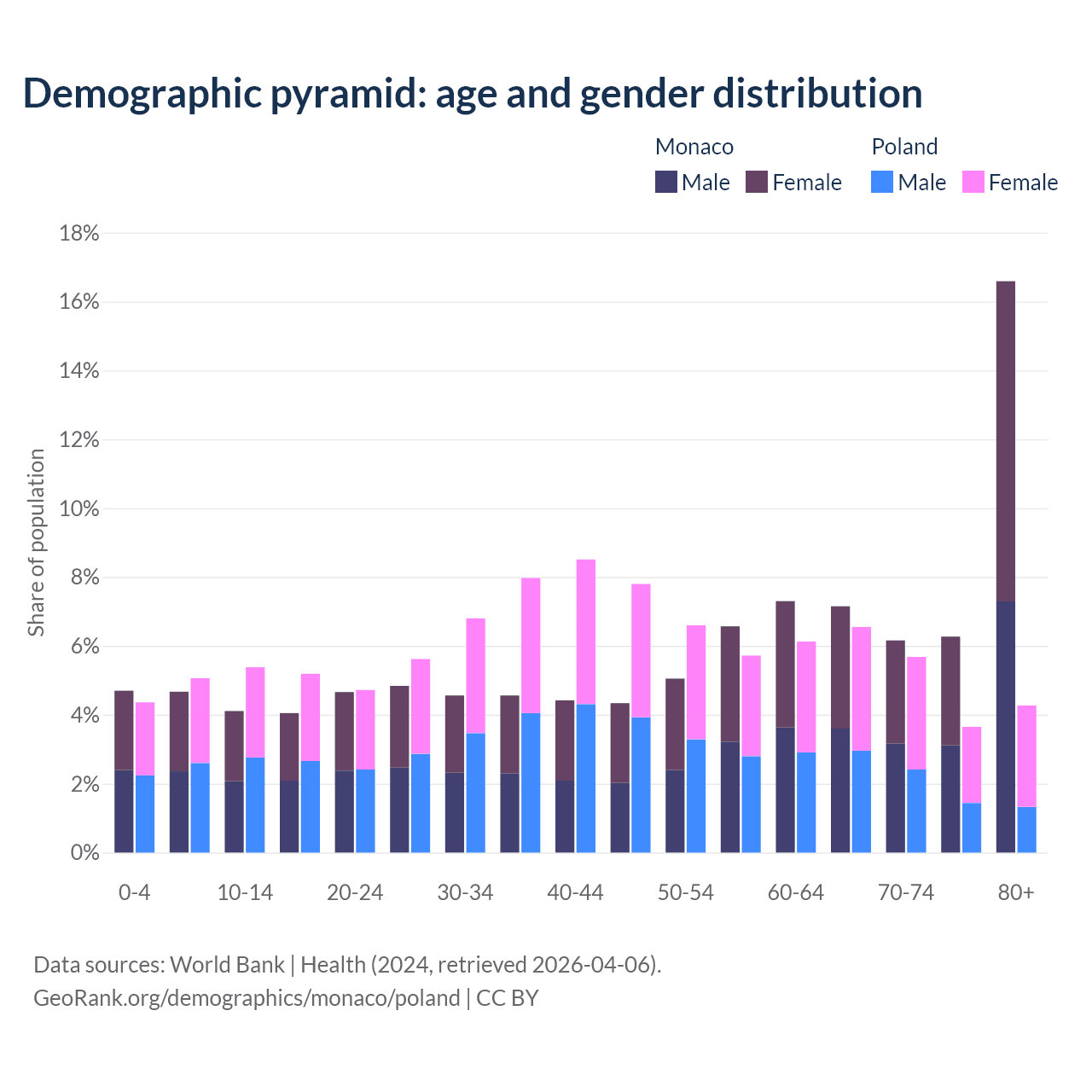 - Monaco is ranked 1/196 by median age (oldest to youngest) vs 30/196 for Poland.