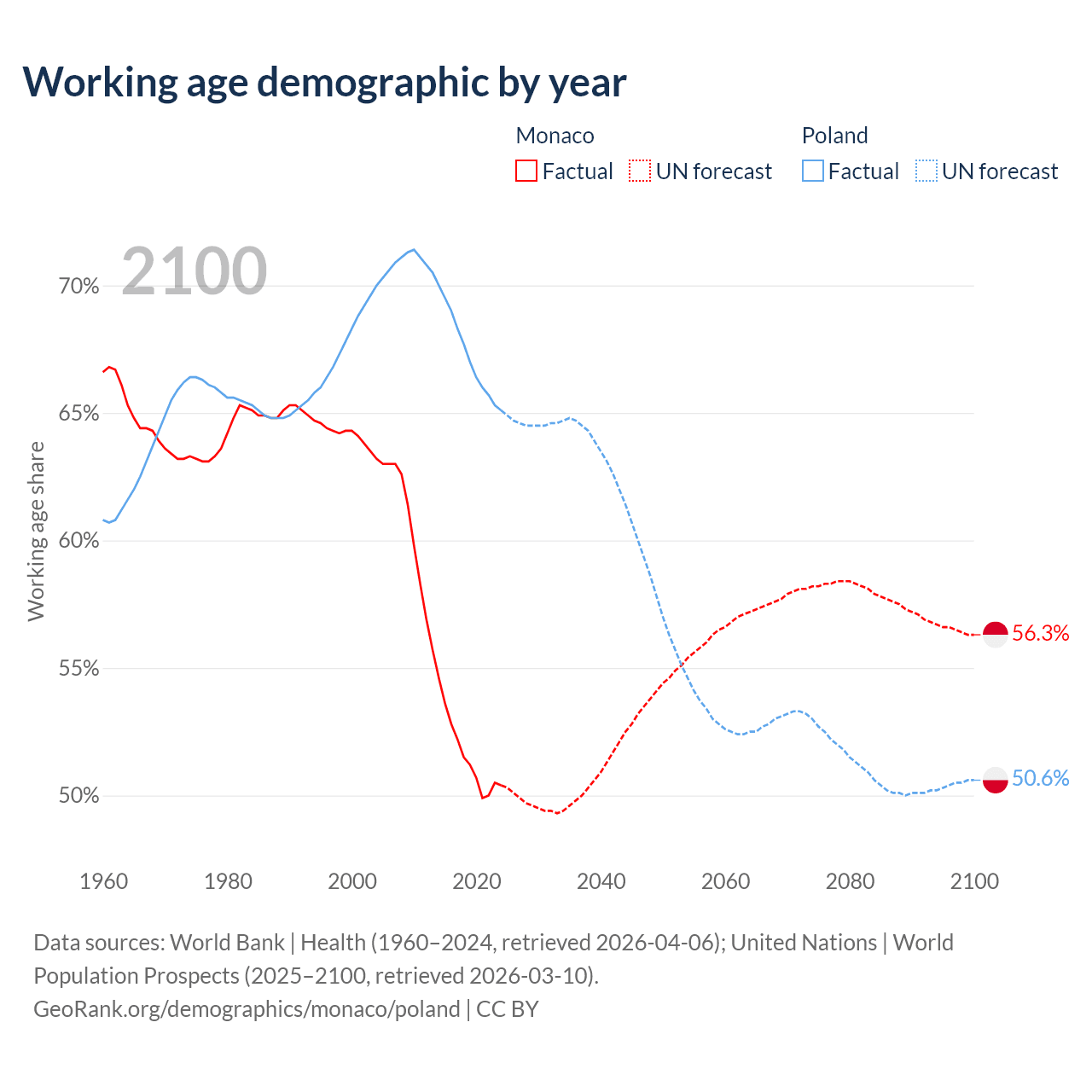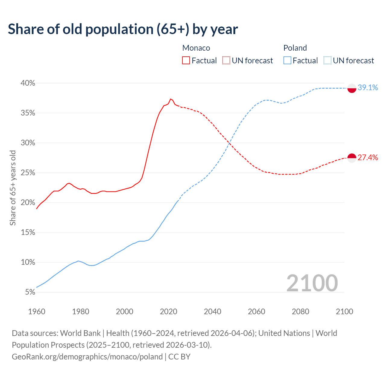 Median age Monaco vs Poland, 1960-2100