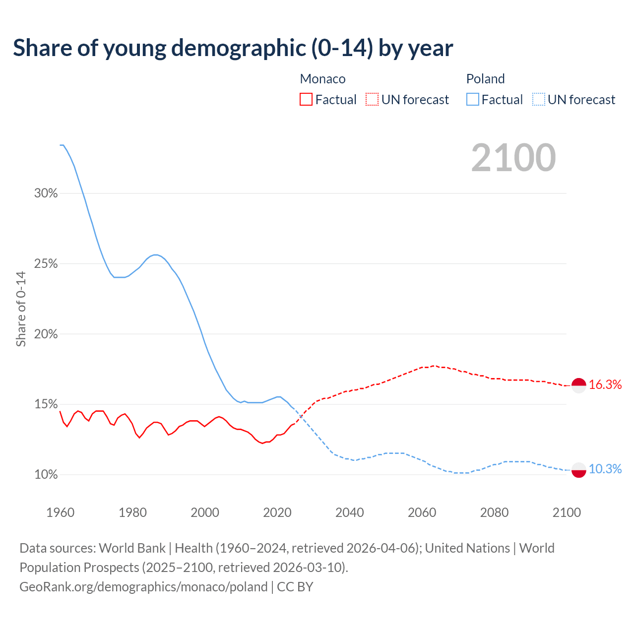 - The share of young demographic (0-15 years old) in Monaco is 13.5% vs 14.8% in Poland.