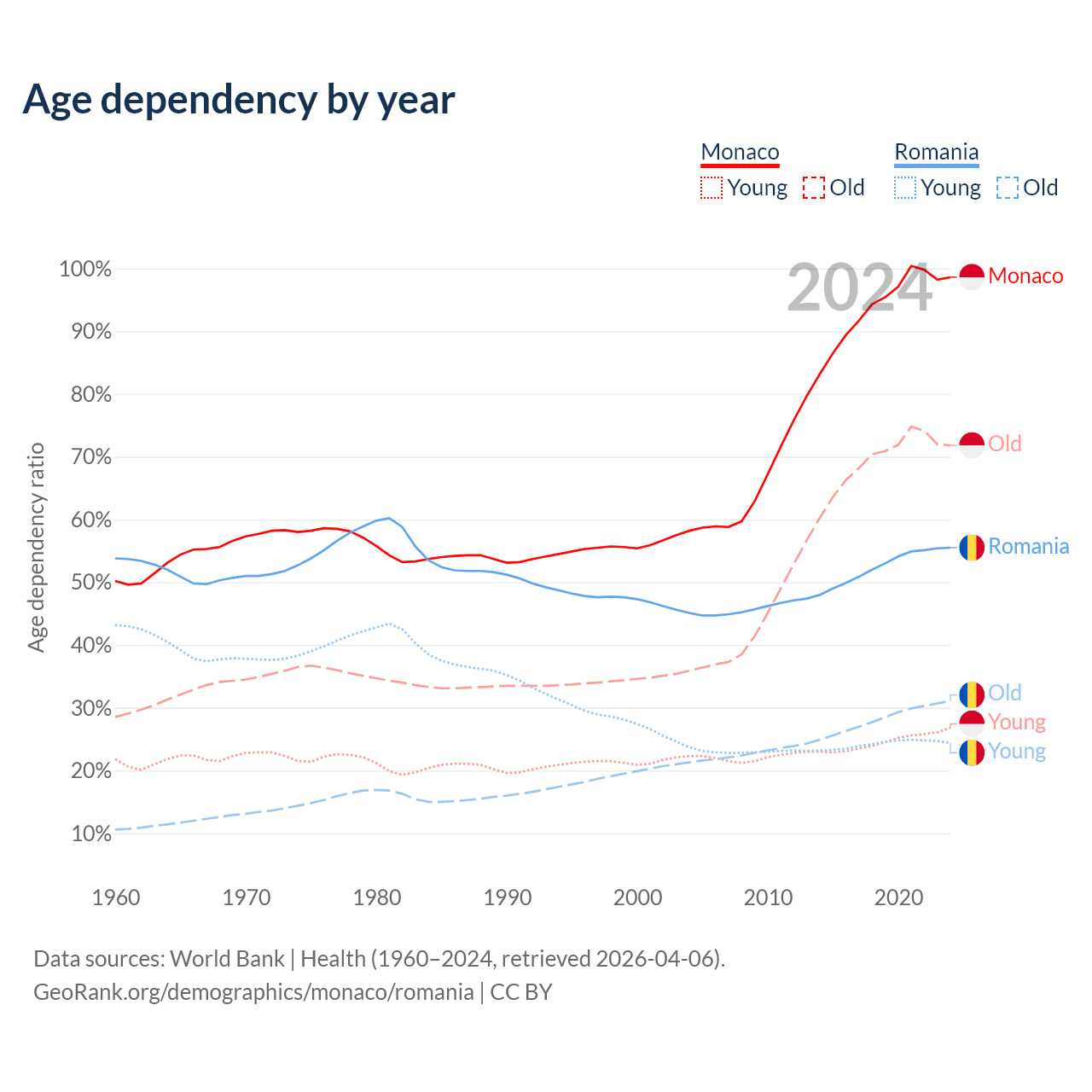 - Monaco is ranked 1/196 by median age (oldest to youngest) vs 23/196 for Romania.