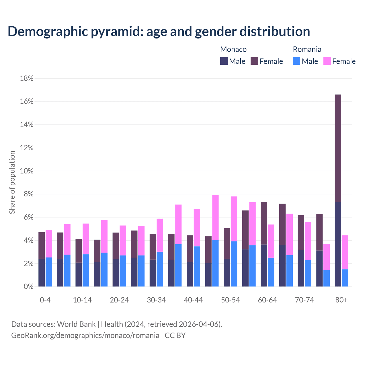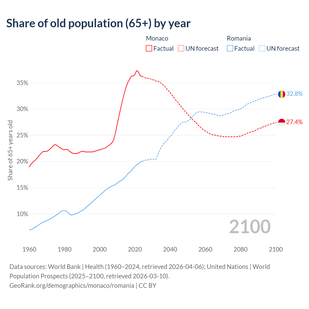 The share of older people aged 65 and over is 36.2% in Monaco and 20% in Romania. Life expectancy in Monaco compared to Romania .