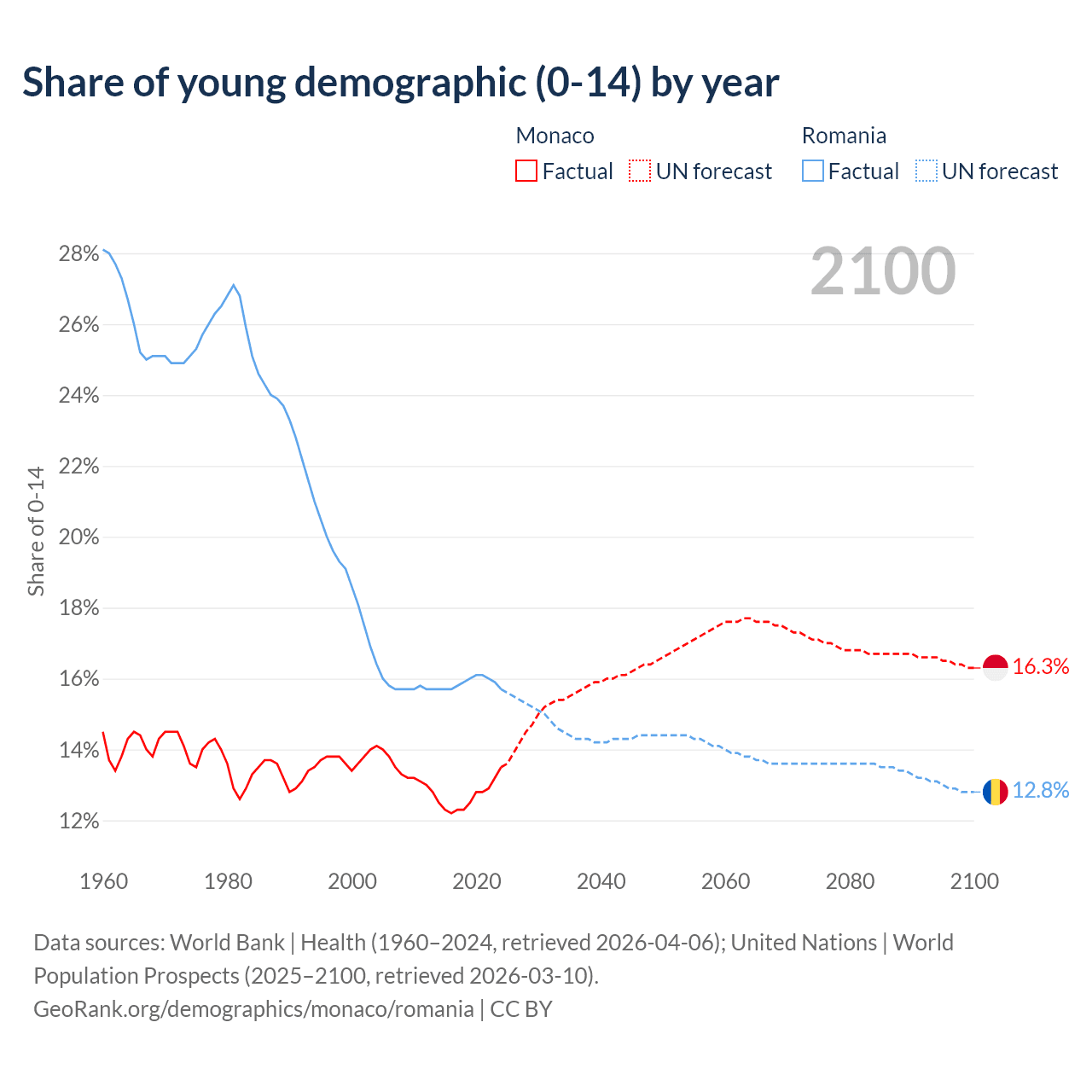 - The share of young demographic (0-15 years old) in Monaco is 13.5% vs 15.7% in Romania.