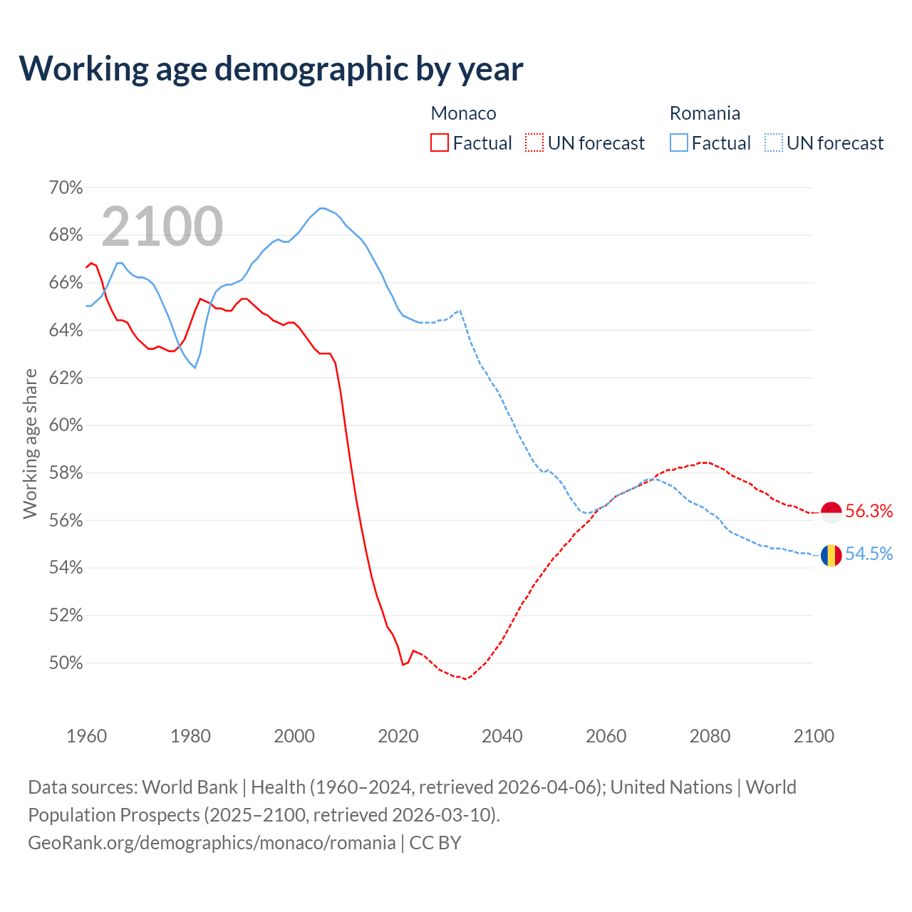 Median age Monaco vs Romania, 1960-2100