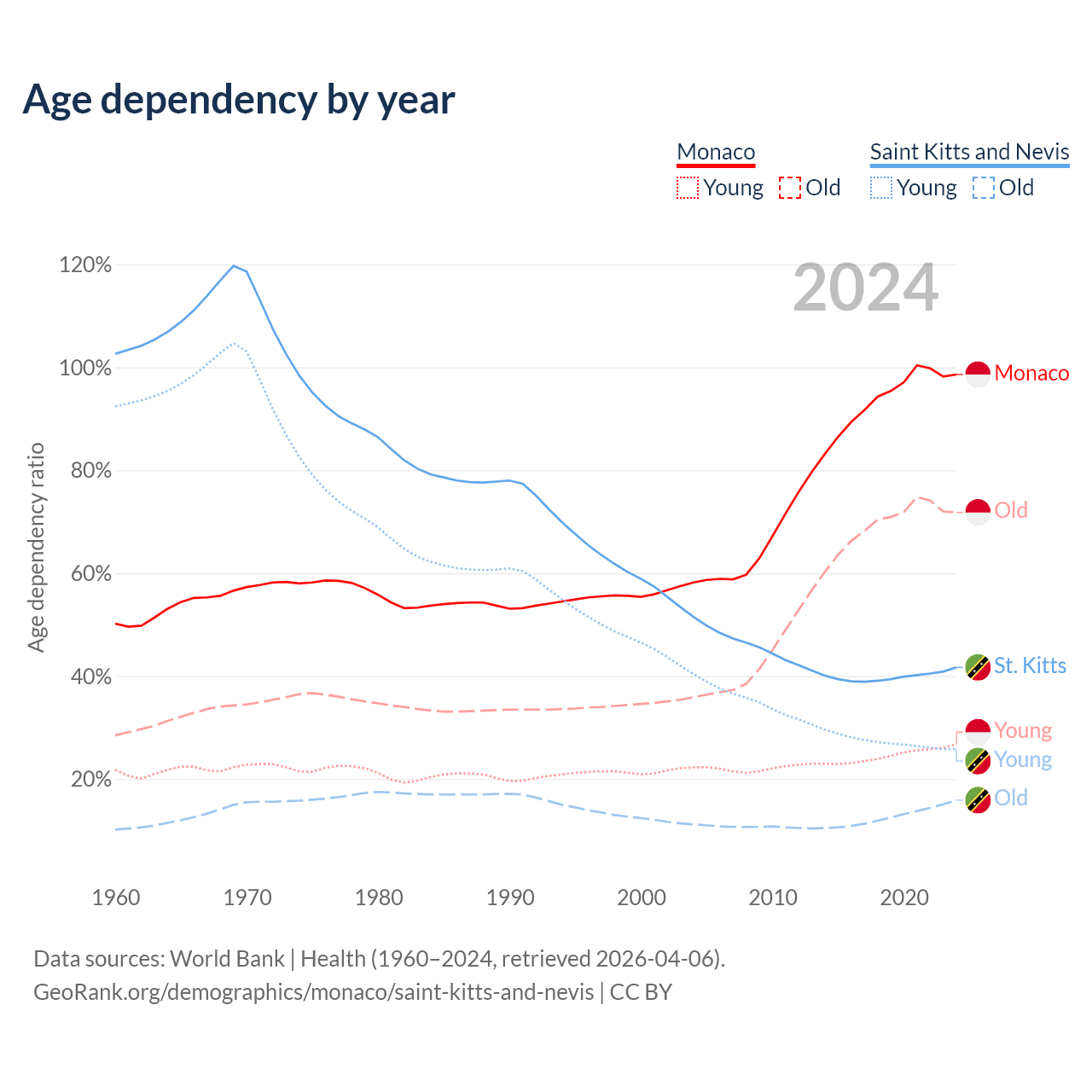 - Monaco is ranked 1/196 by median age (oldest to youngest) vs 69/196 for Saint Kitts and Nevis.