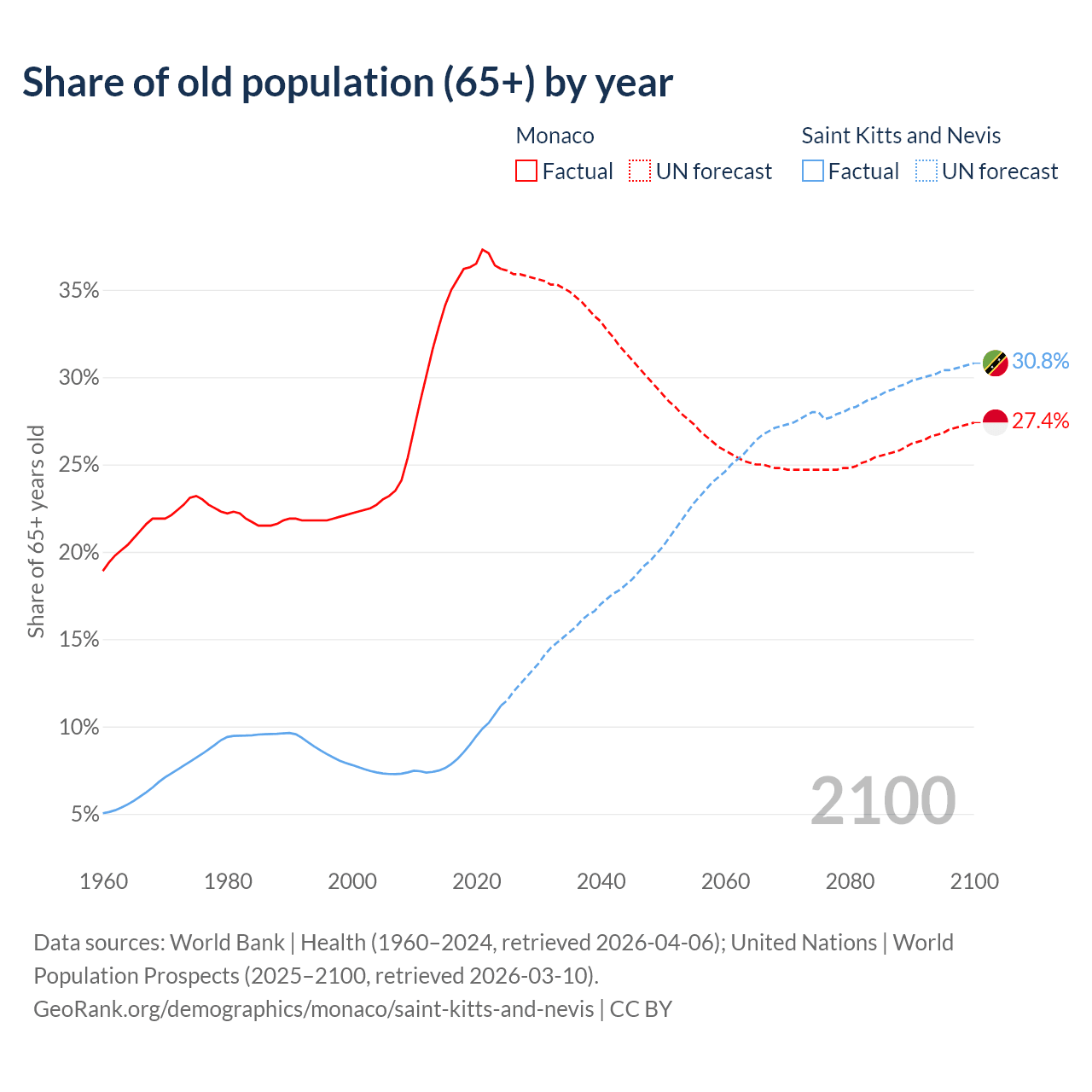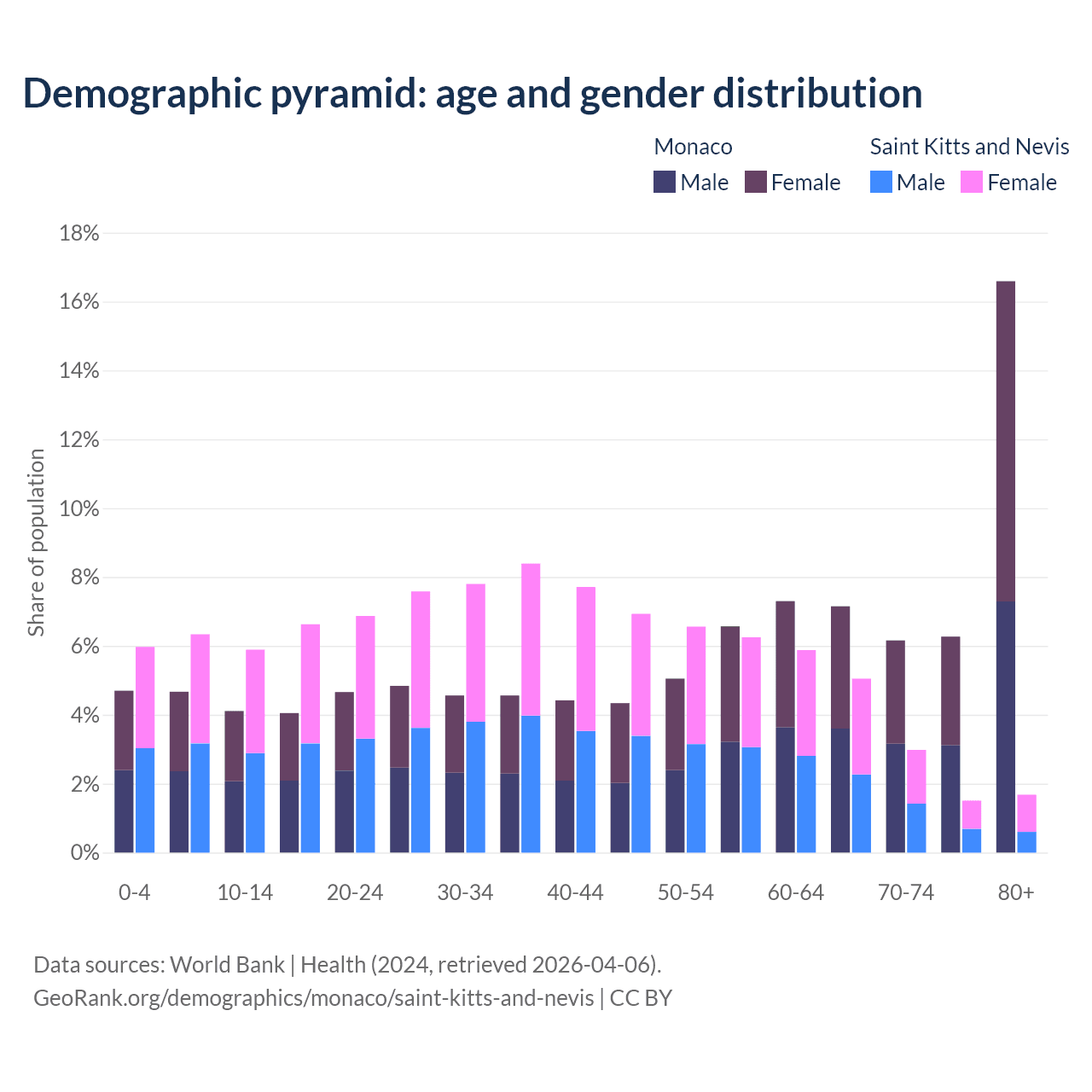 The share of older people aged 65 and over is 36.2% in Monaco and 11.2% in Saint Kitts and Nevis. Life expectancy in Monaco compared to Saint Kitts and Nevis .
