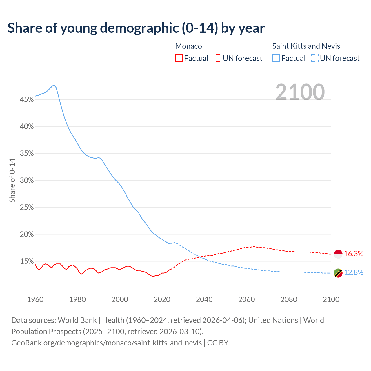 - The share of young demographic (0-15 years old) in Monaco is 13.5% vs 18.2% in Saint Kitts and Nevis.