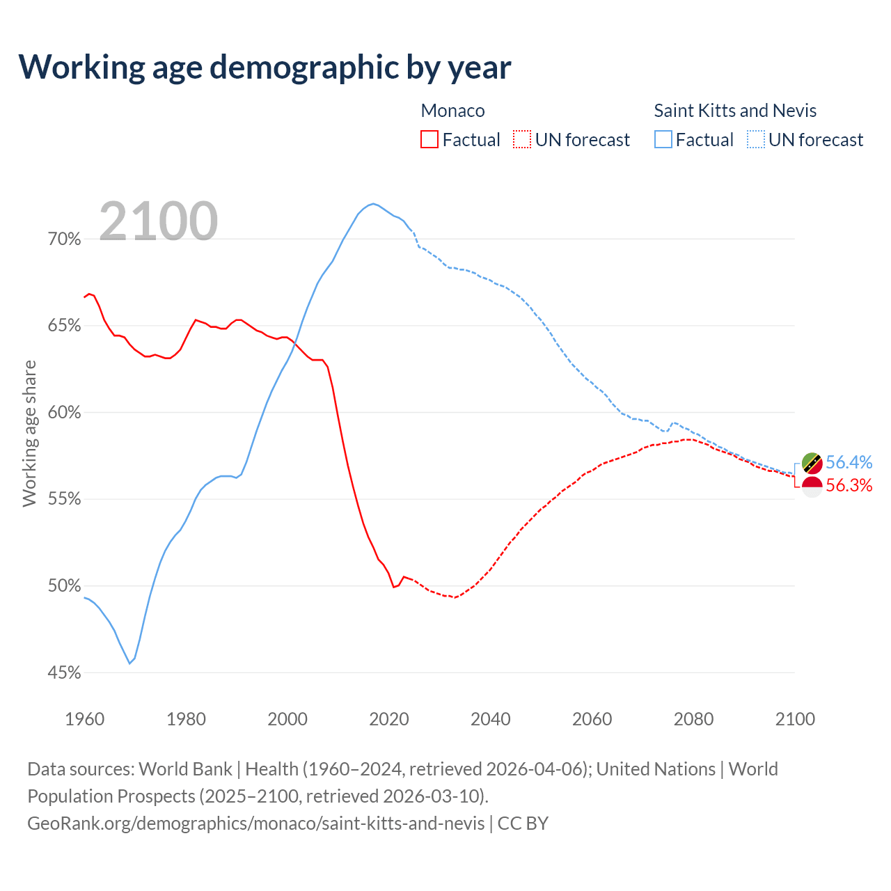 Median age Monaco vs Saint Kitts and Nevis, 1960-2100