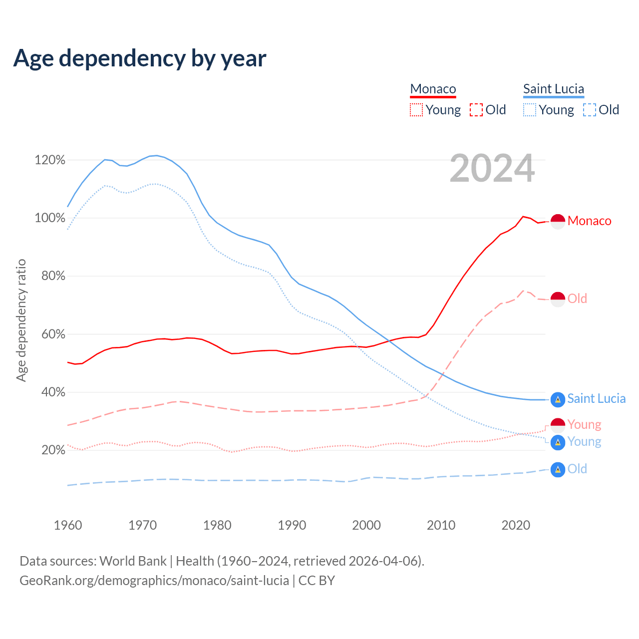 - Monaco is ranked 1/196 by median age (oldest to youngest) vs 74/196 for Saint Lucia.
