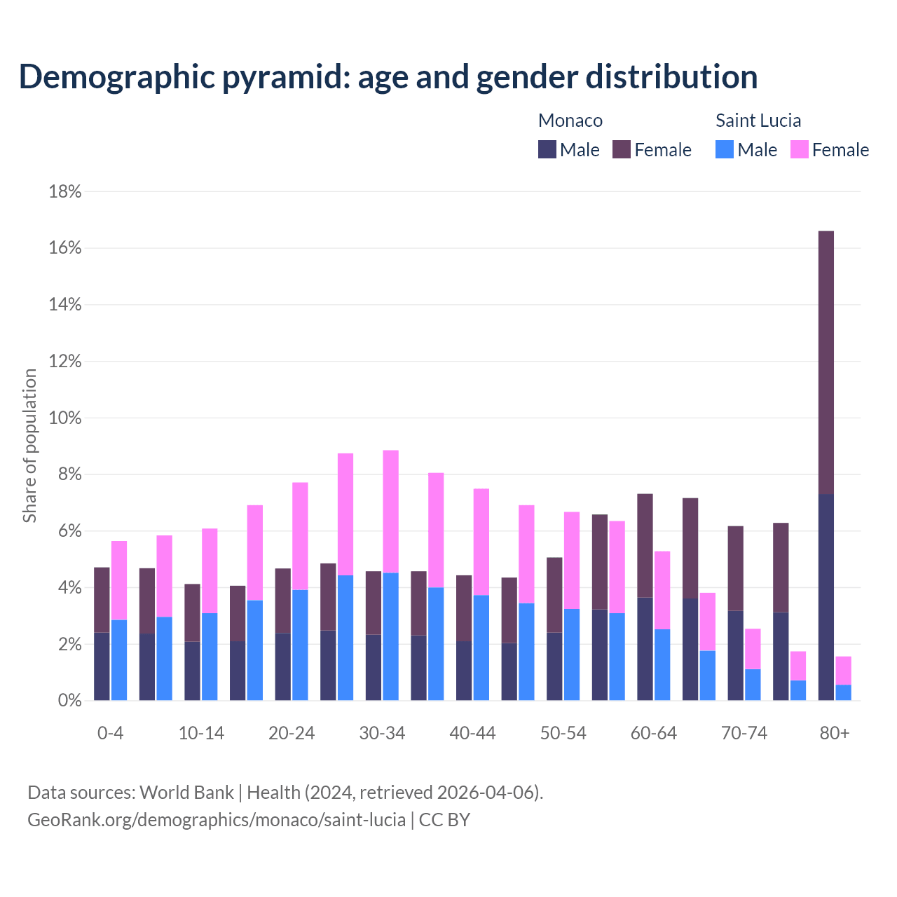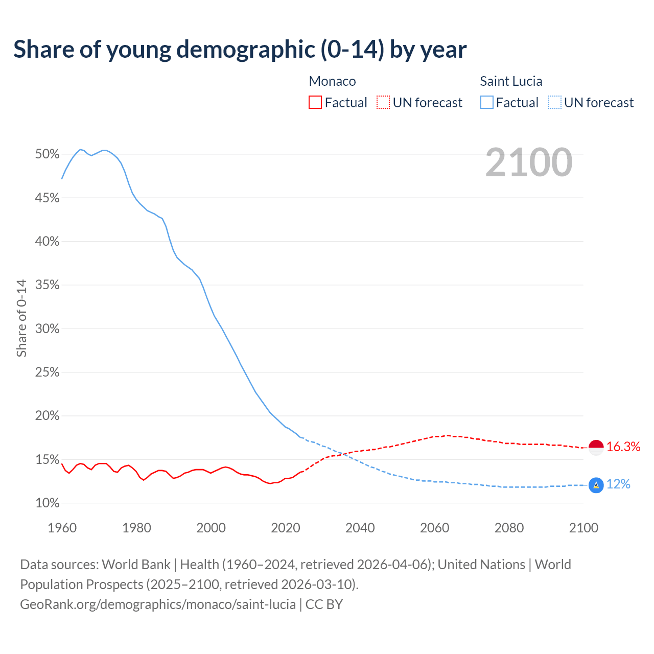 - The share of young demographic (0-15 years old) in Monaco is 13.5% vs 17.5% in Saint Lucia.