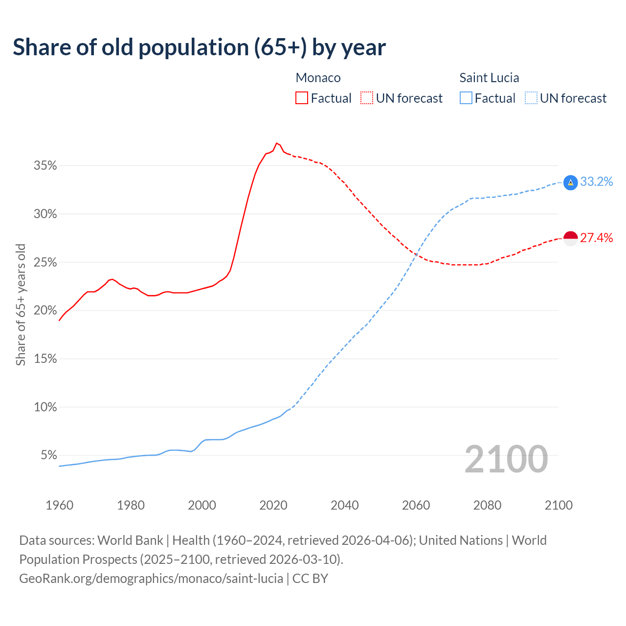 - The share of old-age demographic (65+) in Monaco is 36.2% vs 9.62% in Saint Lucia.
