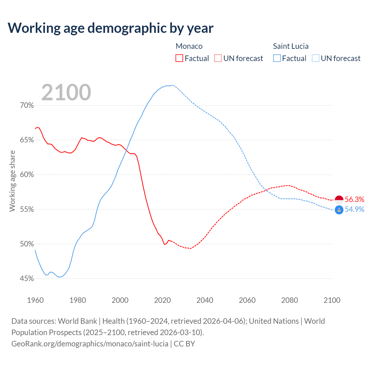 - Monaco has 19.2K working age adults (aged 15-64) vs 132K in Saint Lucia.